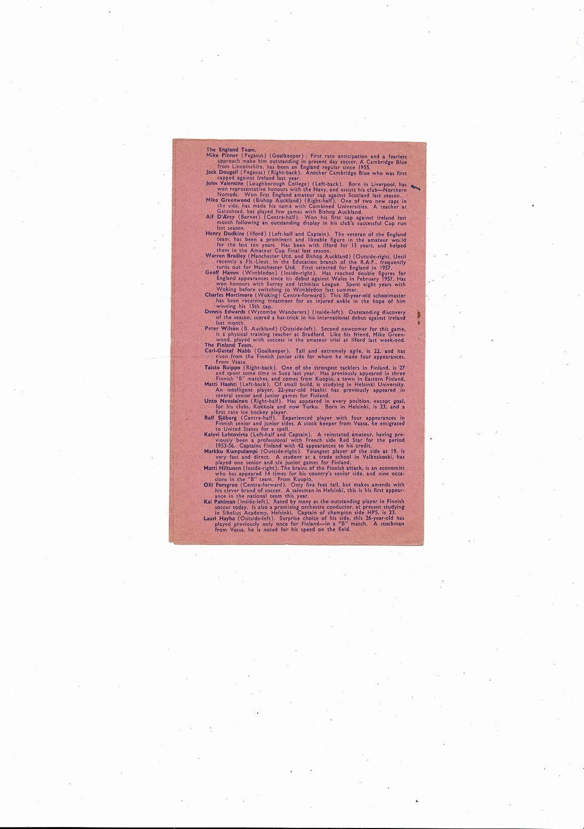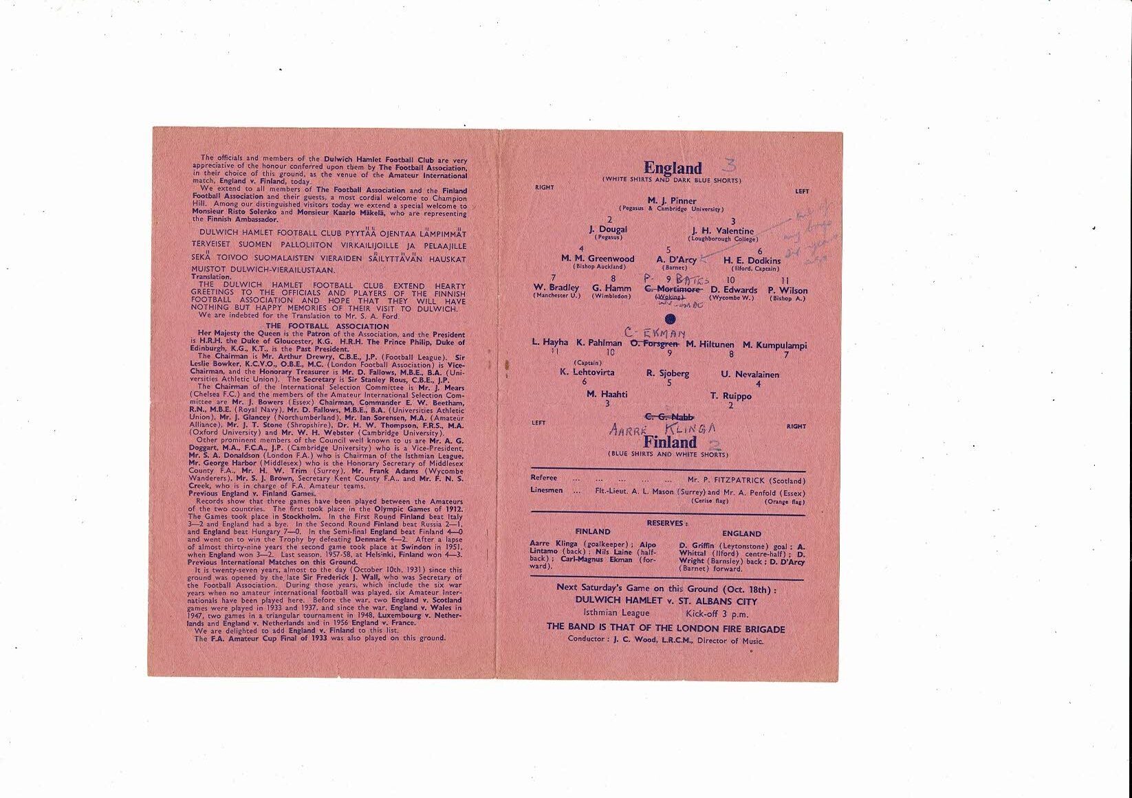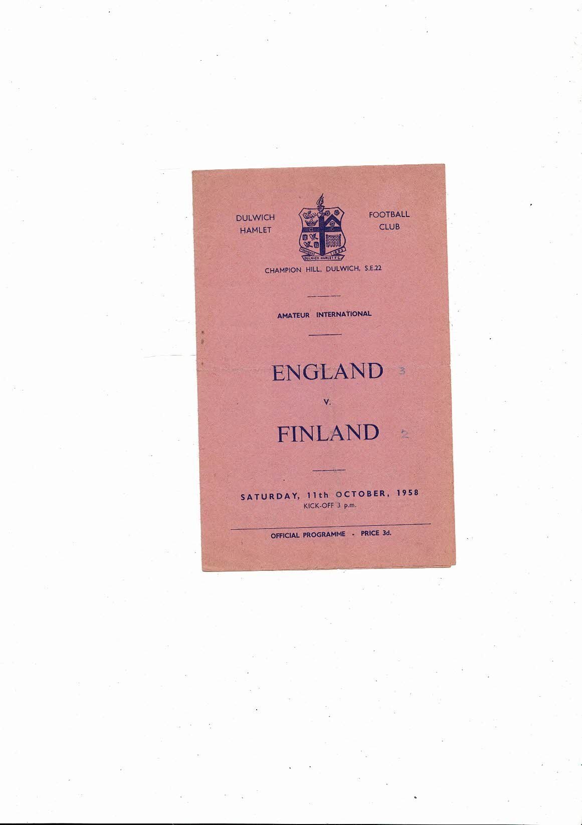 1958 England v Finland Amateur International Football Programme @ Dulwich