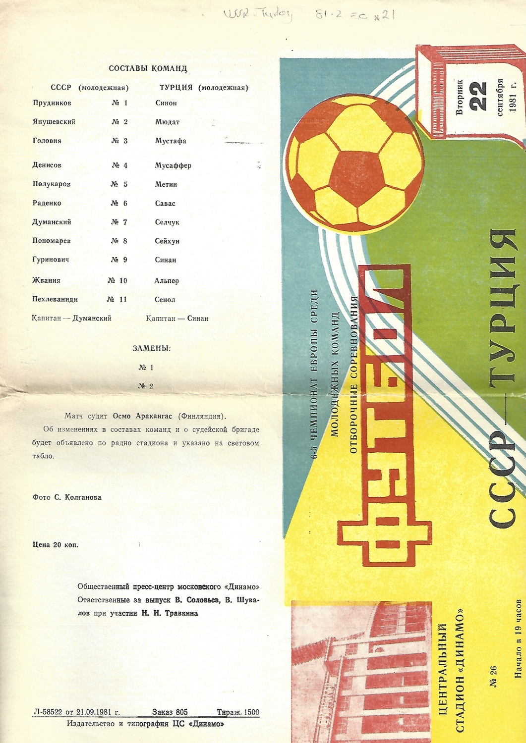 Russia U-21 v Turkey U-21 Football Programme 1981