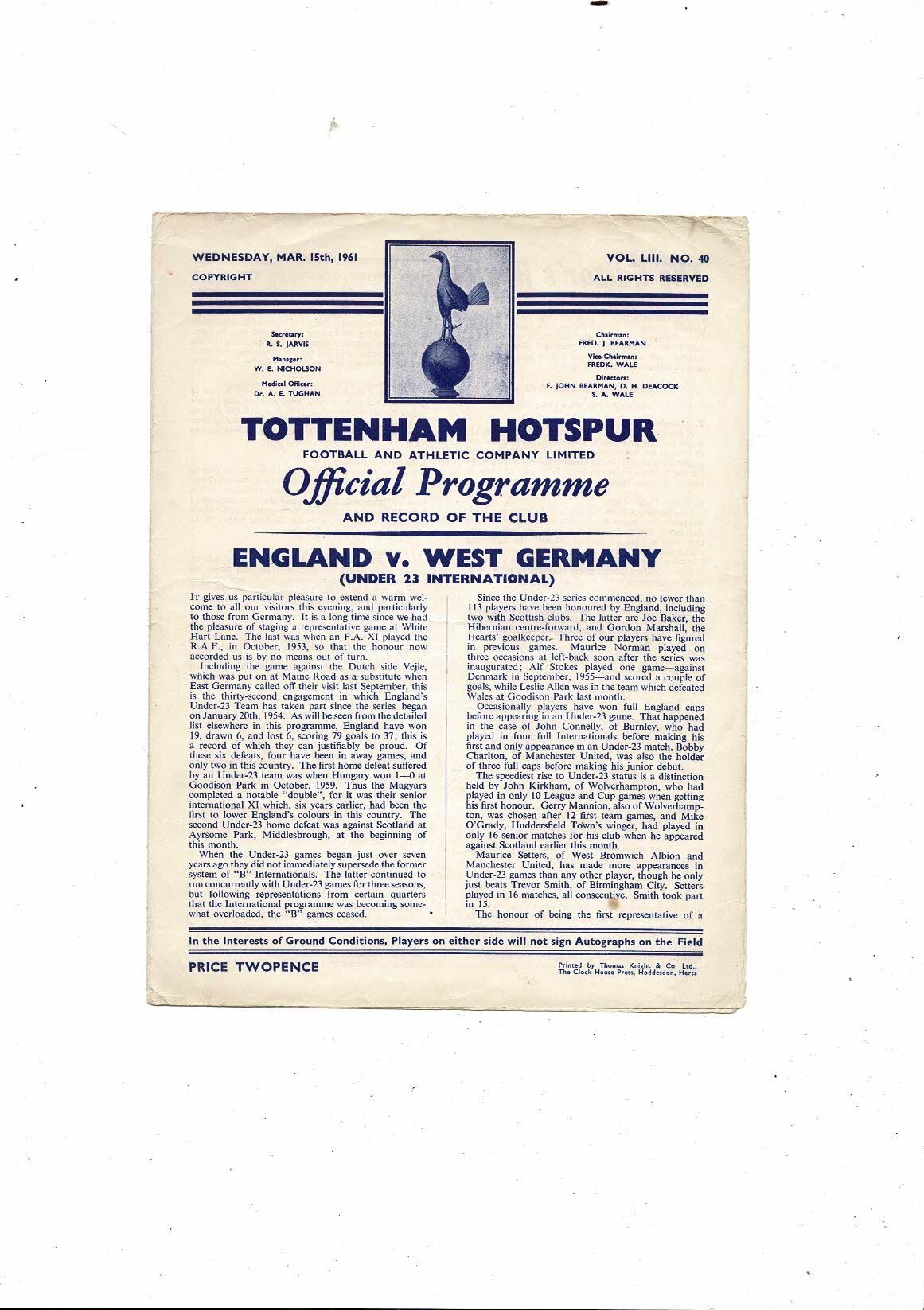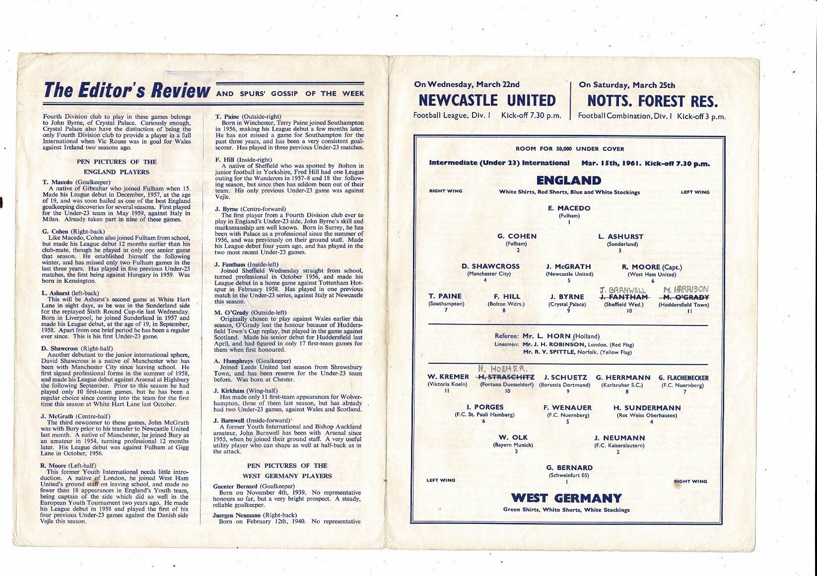 1961 England v West Germany U23 International Football Programme @ Spurs