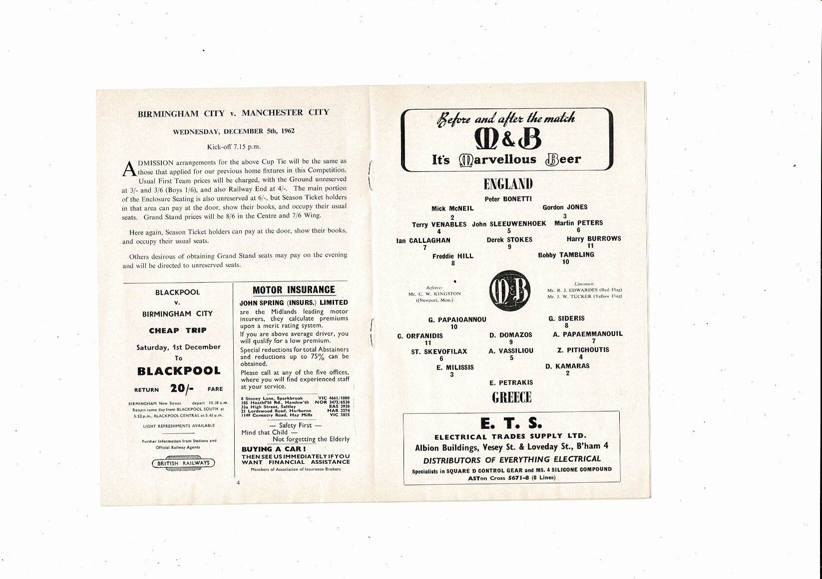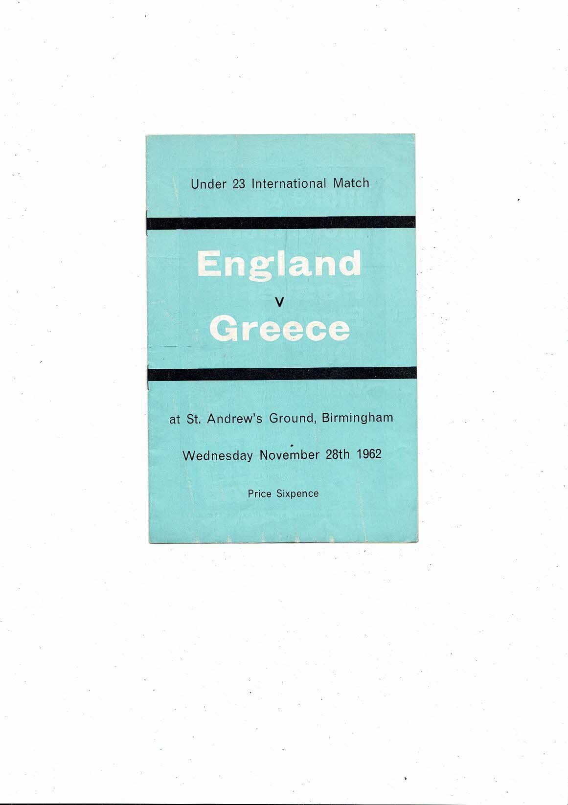 1962 England v Greece U23 Football Programme @ Birmingham City