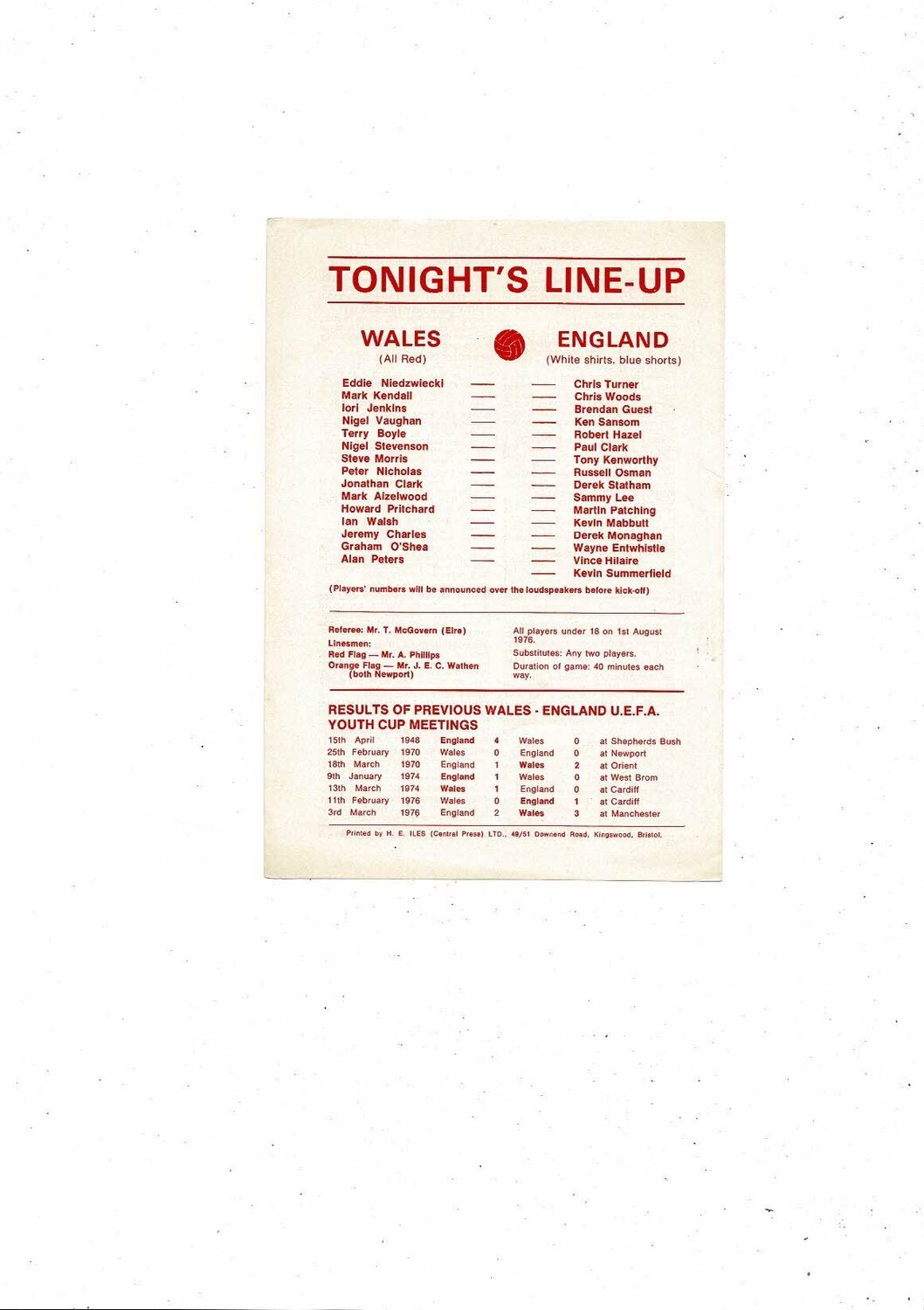 1977 Wales v England Youth International Football Programme @ Cardiff City