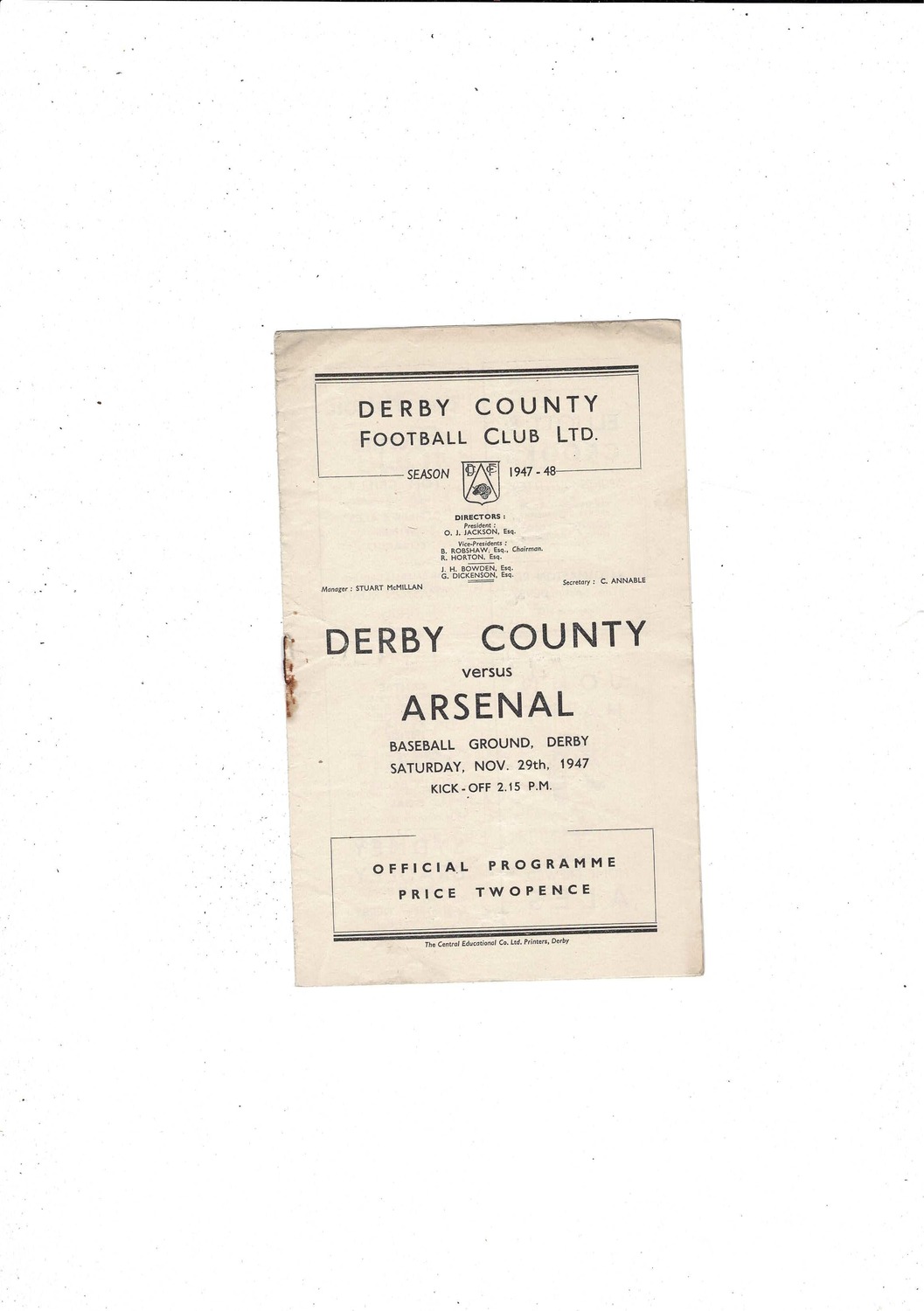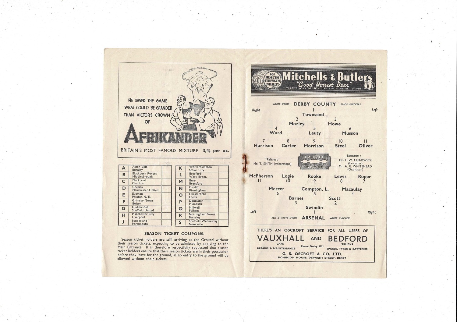 1947/48 Derby County v Arsenal Football Programme