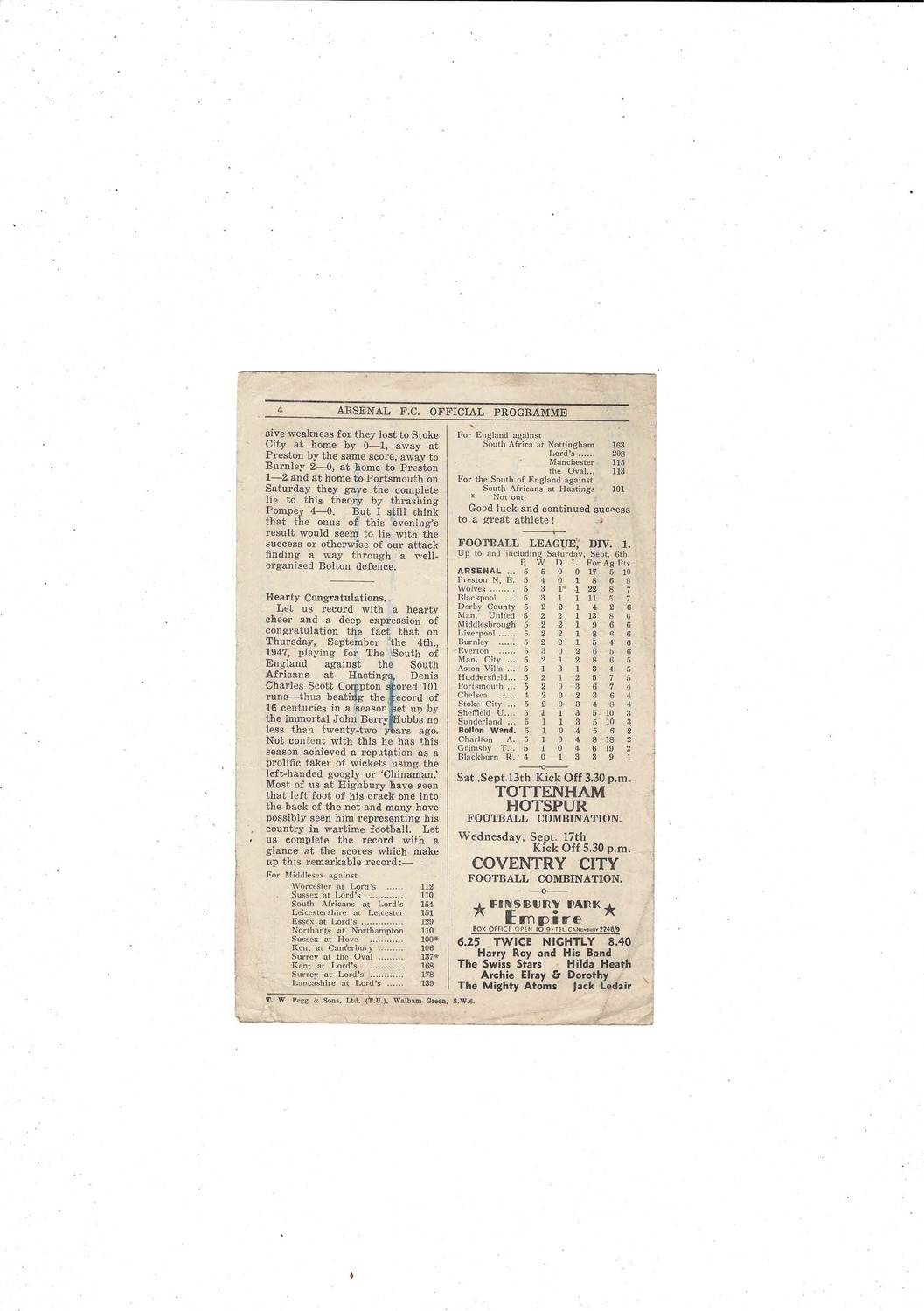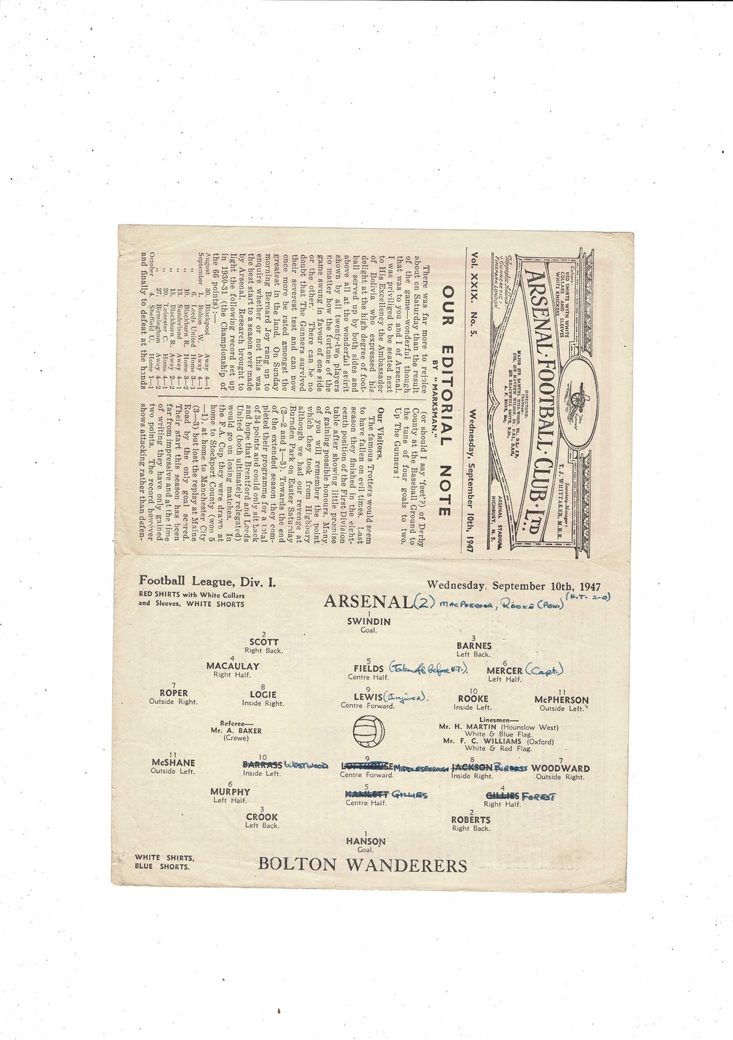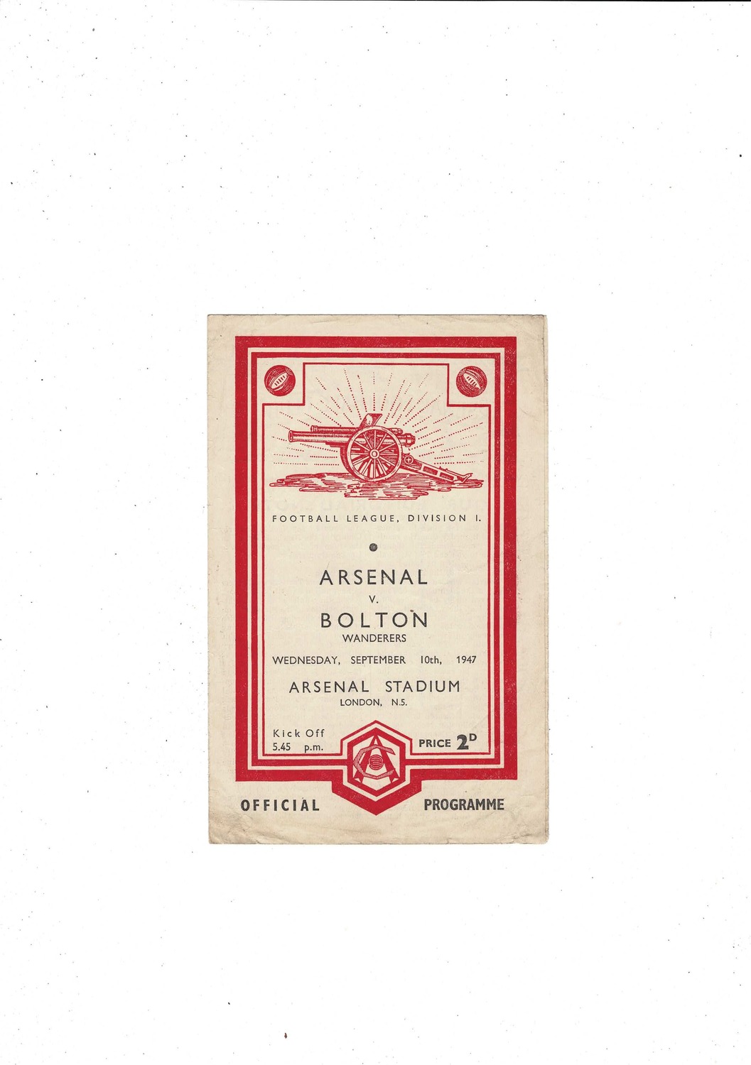 1947/48 Arsenal v Bolton Wanderers Football Programme