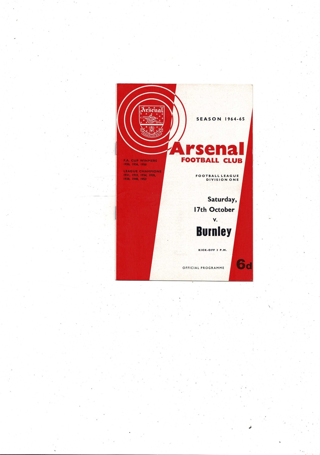 1964/65 Arsenal v Burnley Football Programme