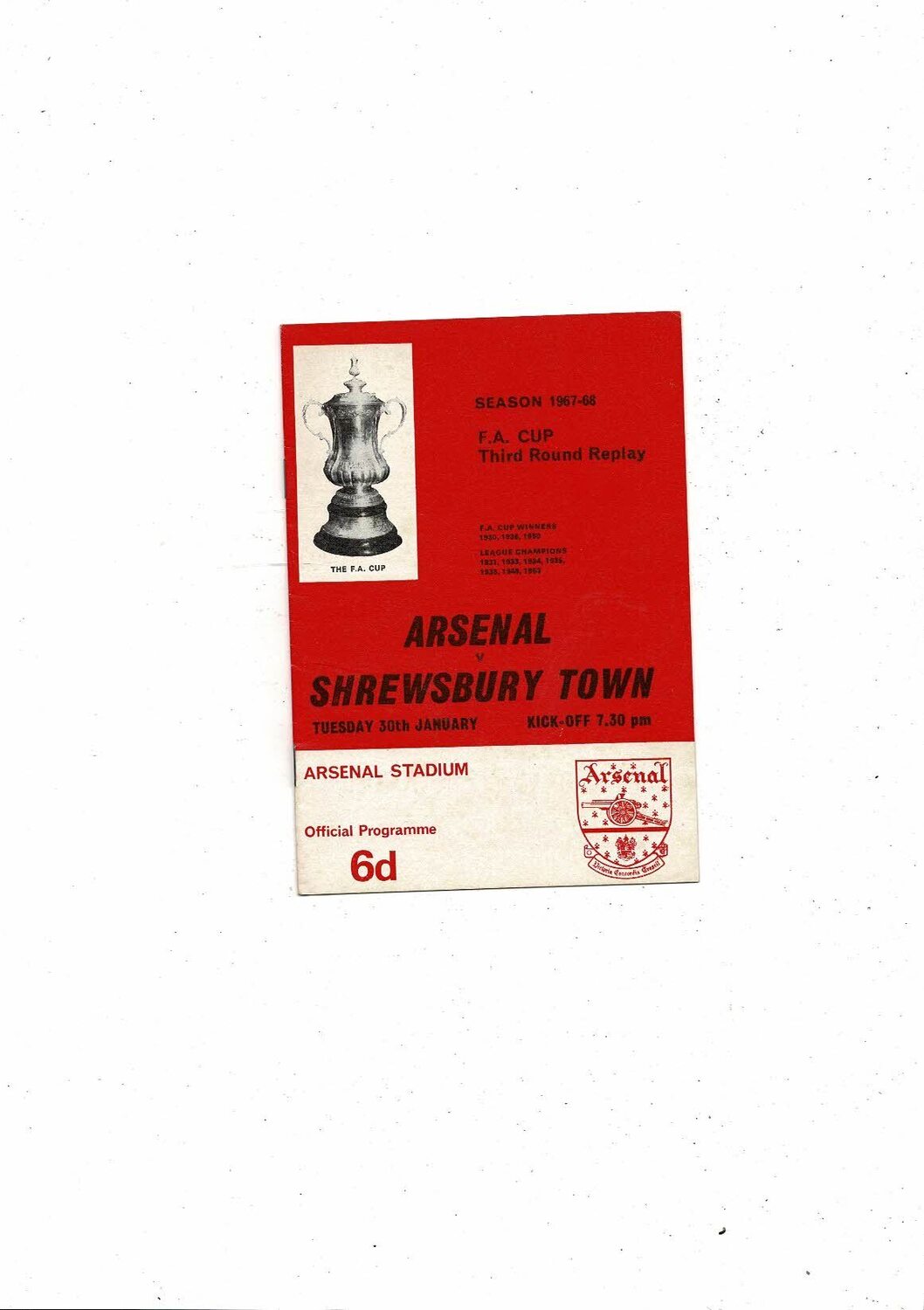 1967/68 Arsenal v Shrewsbury Town FA Cup Replay Football Programme
