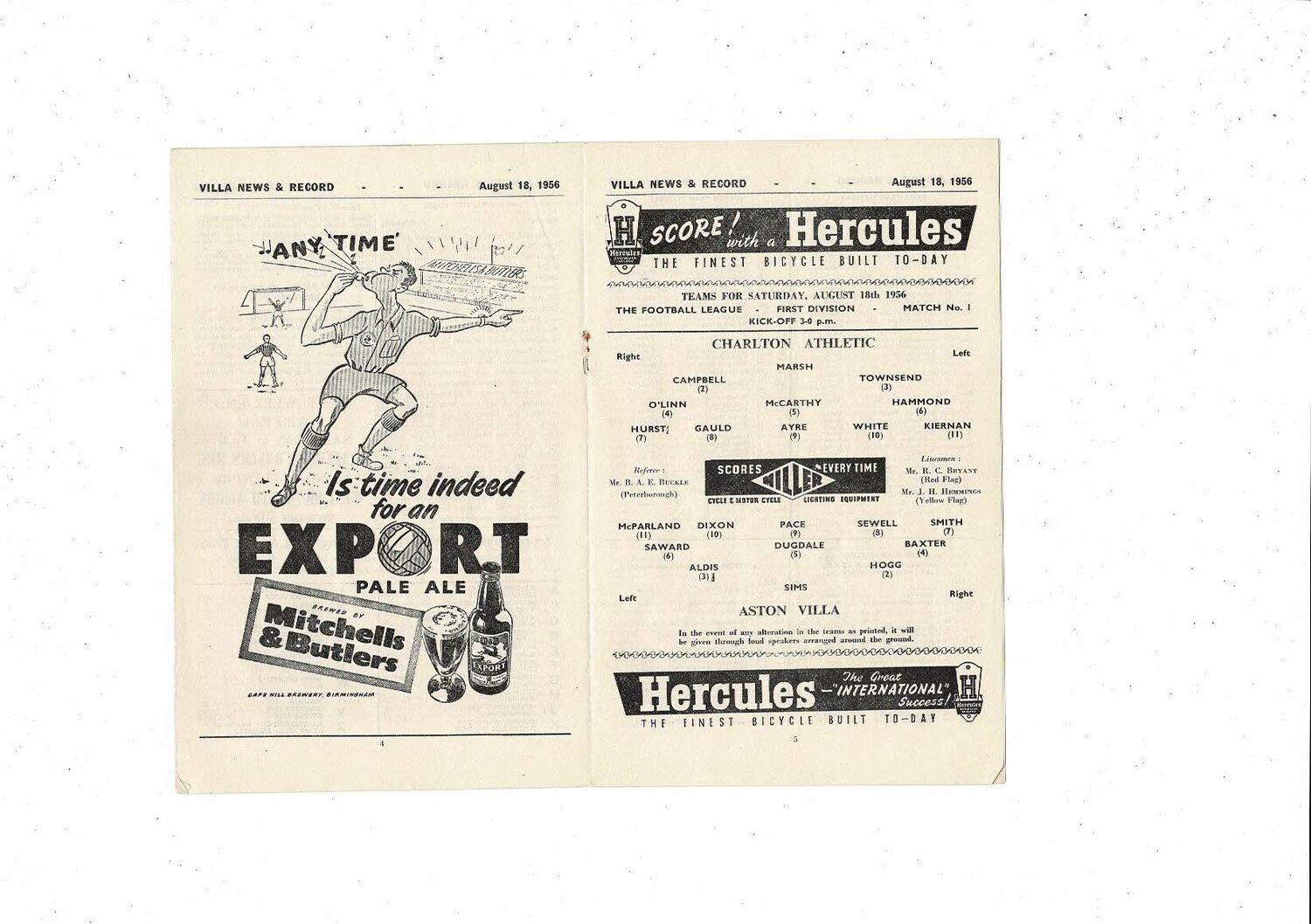 1956/57 Aston Villa v Charlton Athletic Football Programme