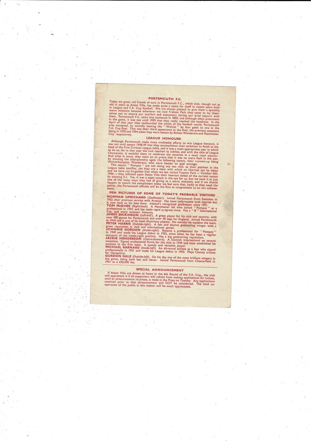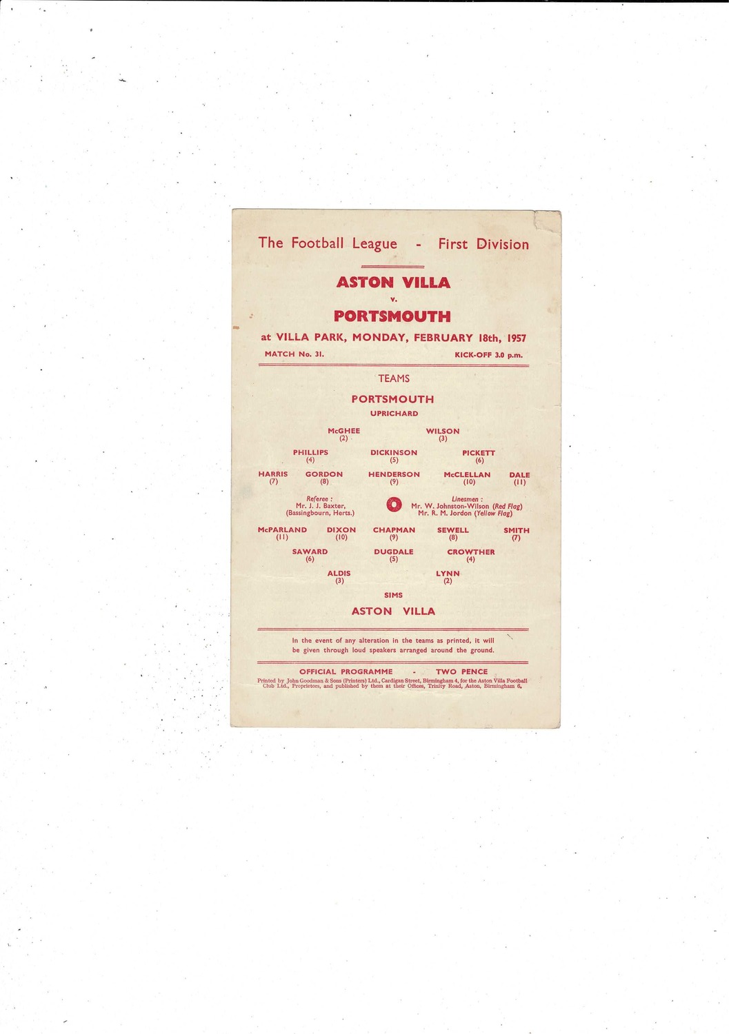 1956/57 Aston Villa v Portsmouth Football Programme
