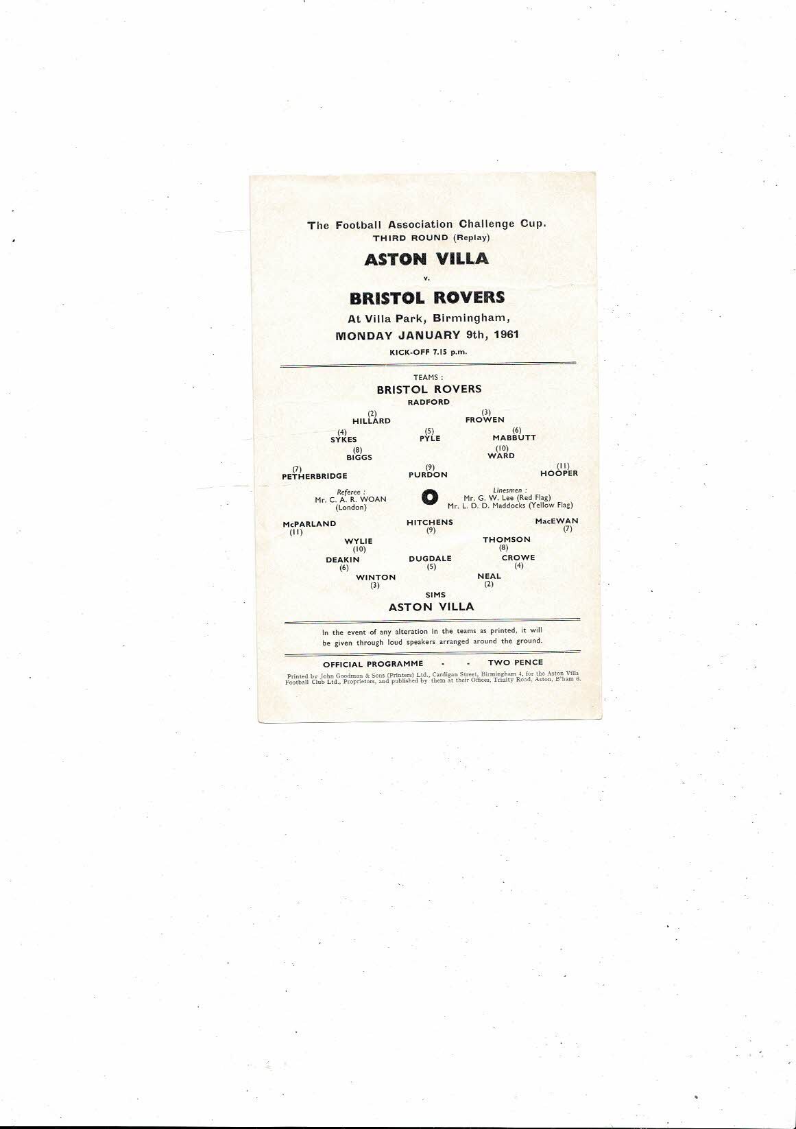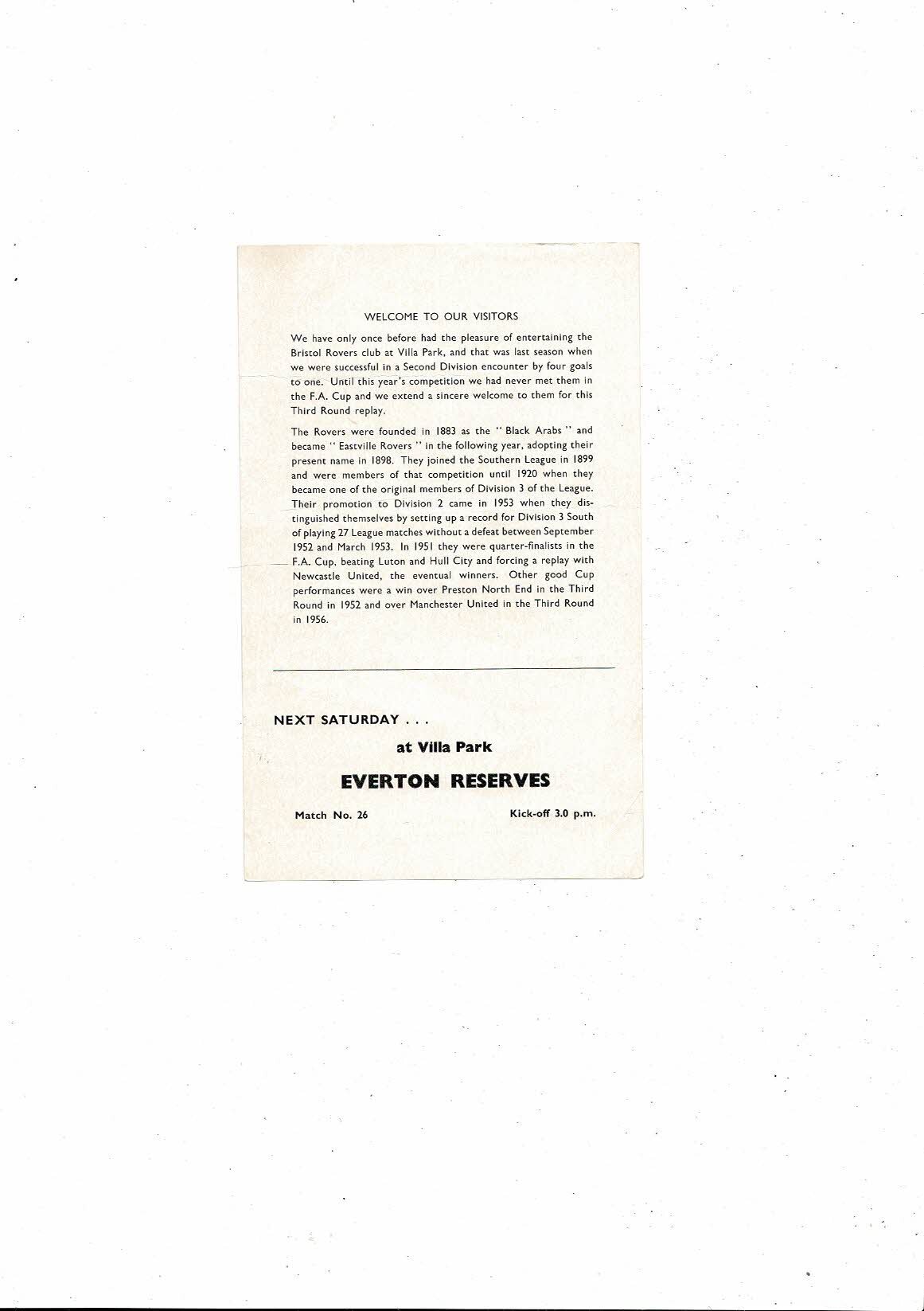 1960/61 Aston Villa v Bristol Rovers FA Cup Replay Football Programme