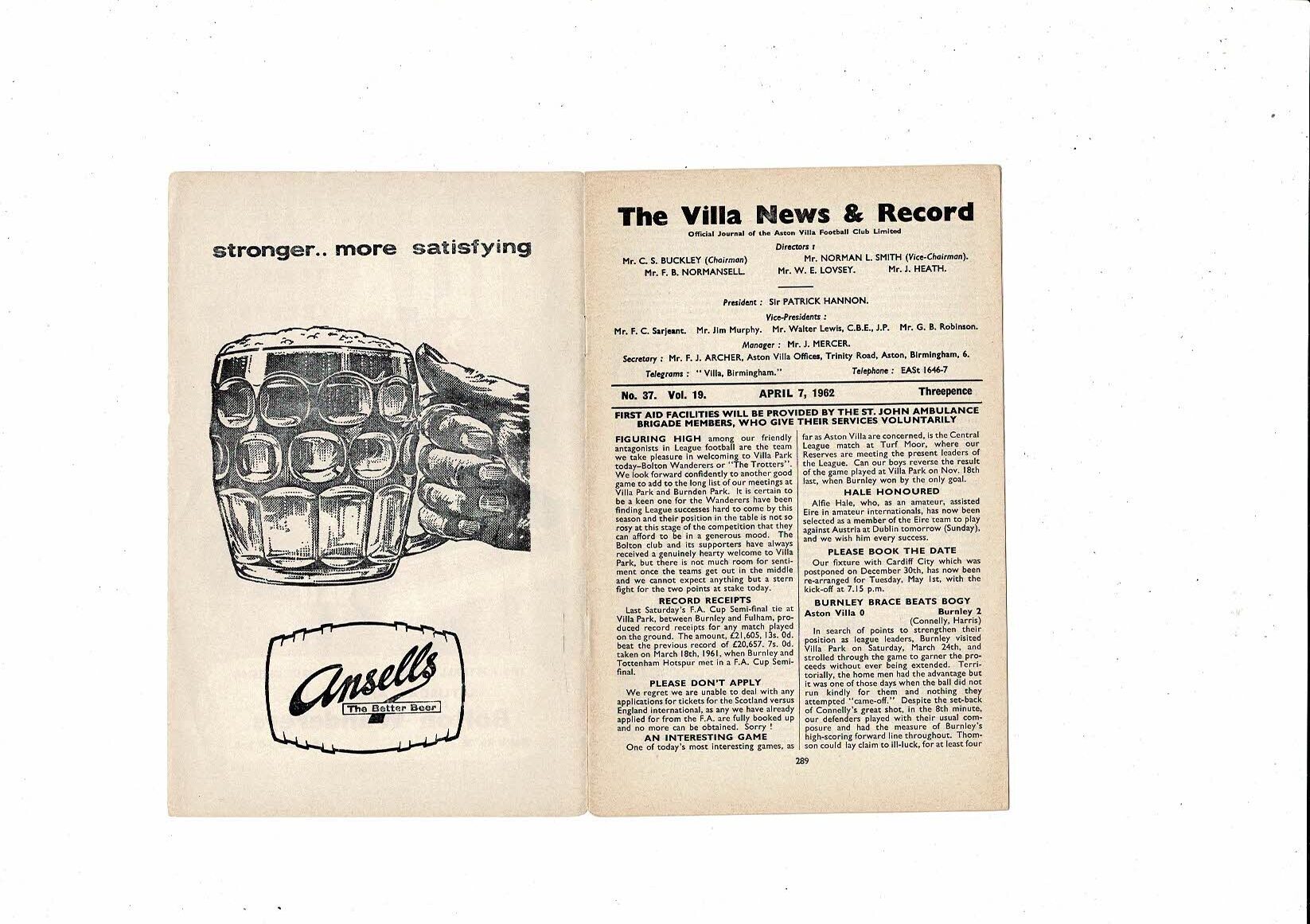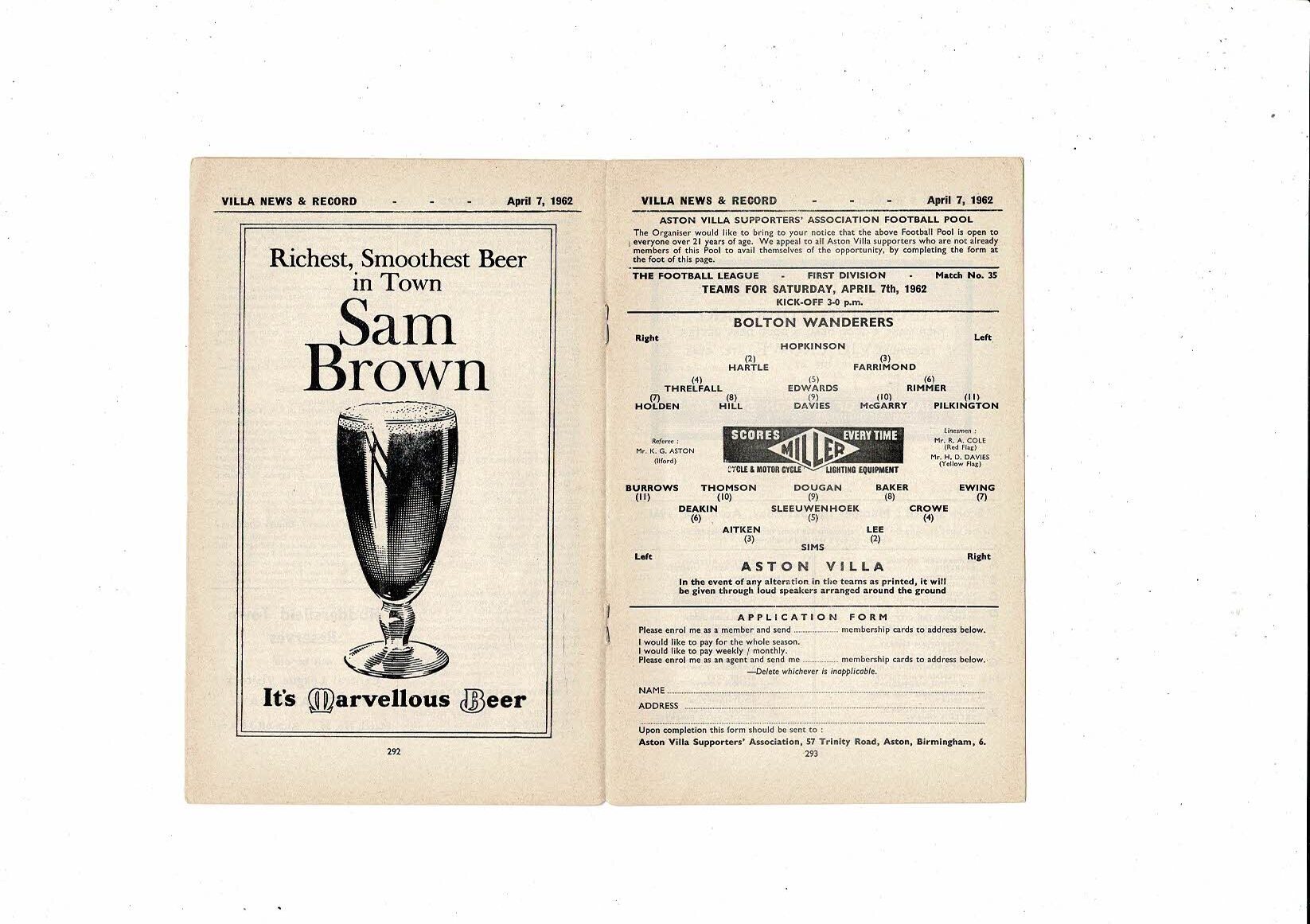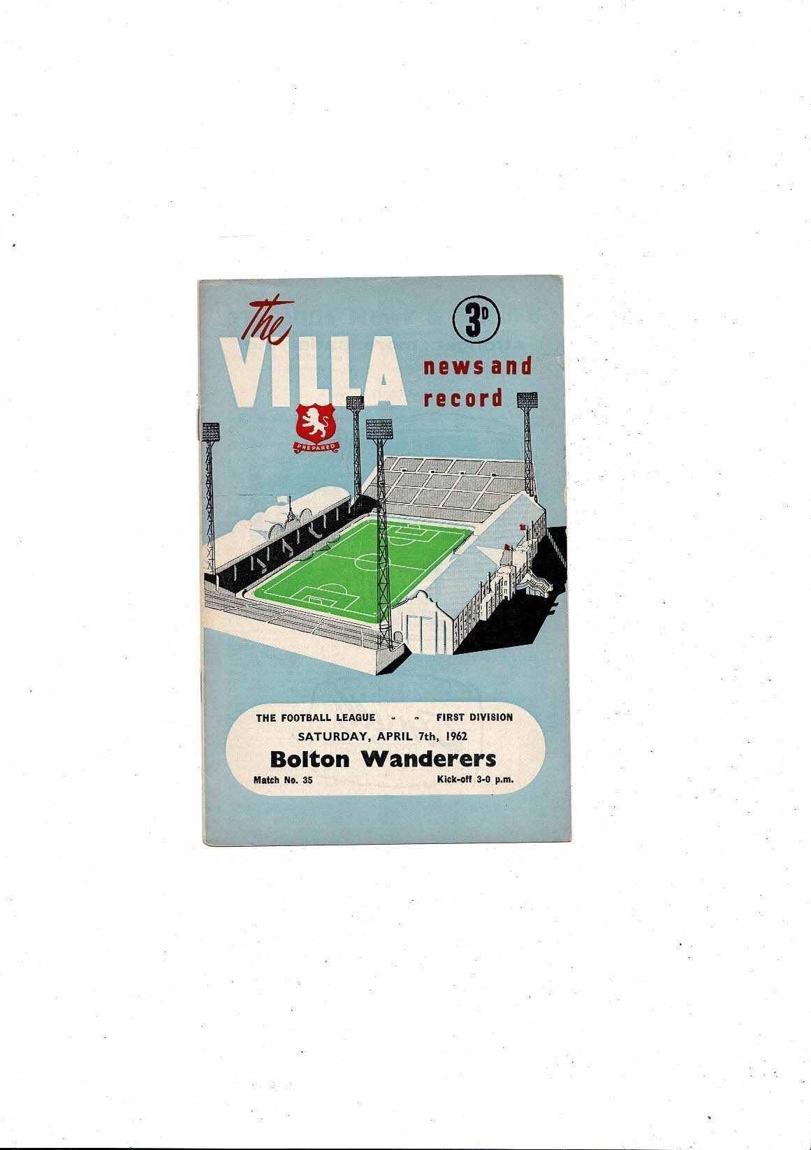 1961/62 Aston Villa v Bolton Wanderers Football Programme