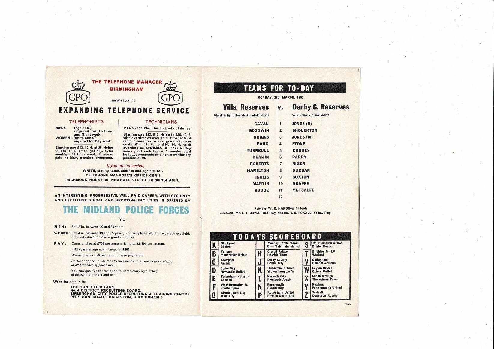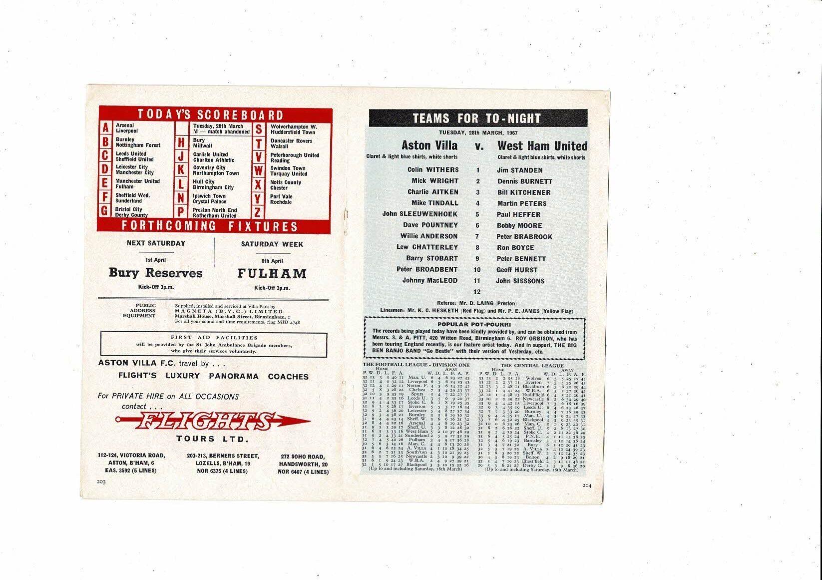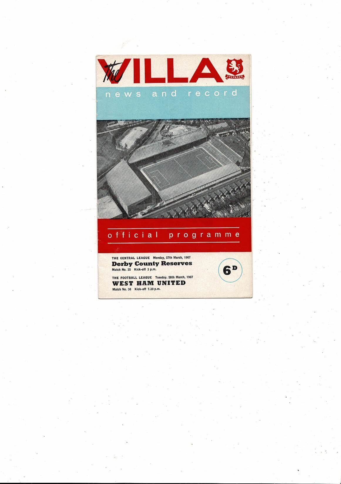 1966/67 Aston Villa v West Ham United & Derby County Reserves Double Football Programme