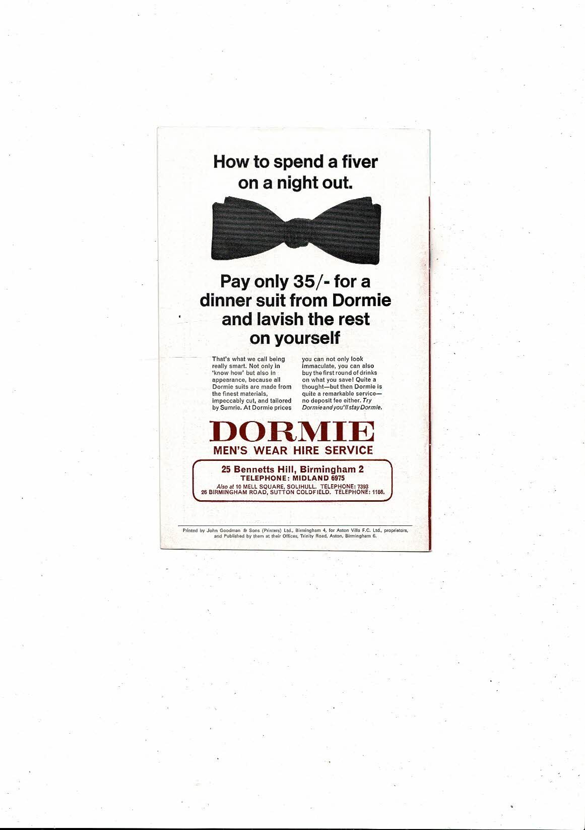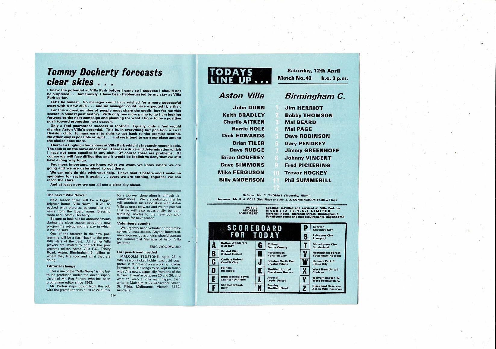 1968/69 Aston Villa v Birmingham City Football Programme