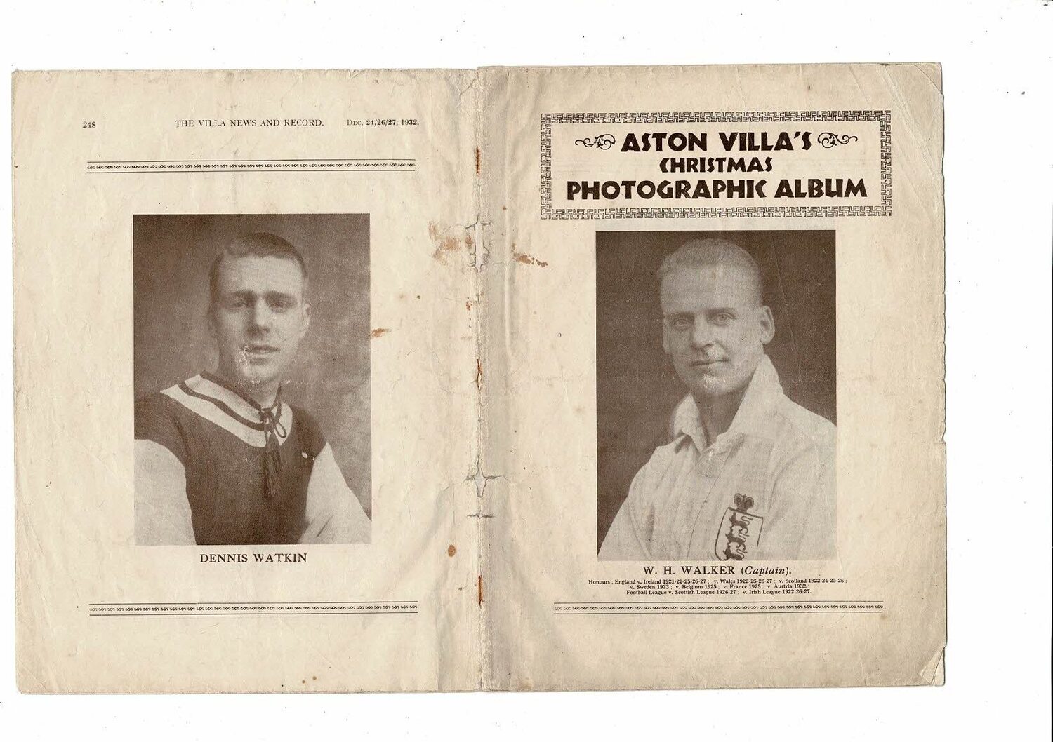 This Original 1932 Aston Villa Christmas Football Photographic Album is creased with some staining, small top corner piece missing on front cover, several small tears, staples have been removed & the spines have been professionally repaired. No handwriting. Please see scans.