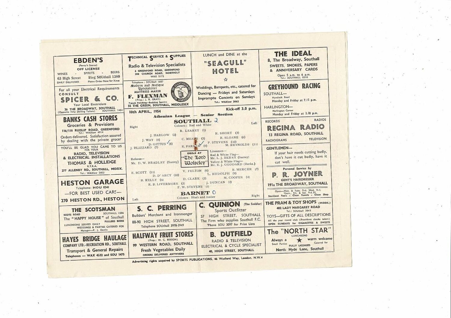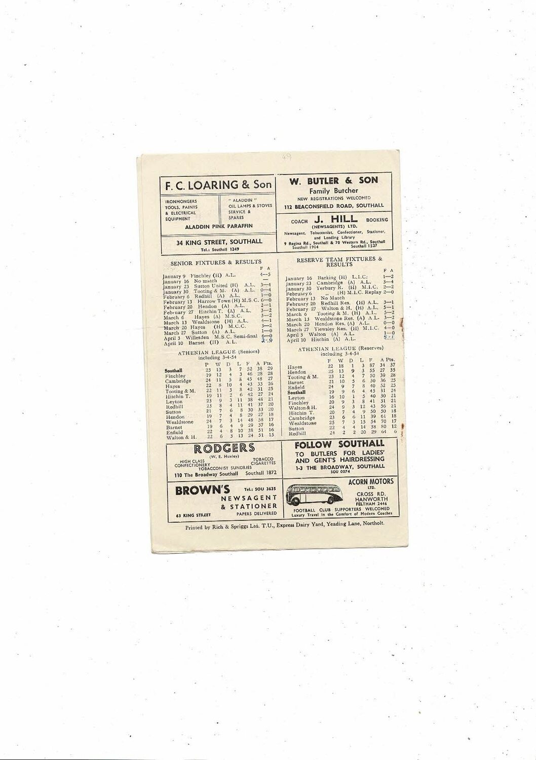 1953/54 Southall v Barnet Athenian League Football Programme