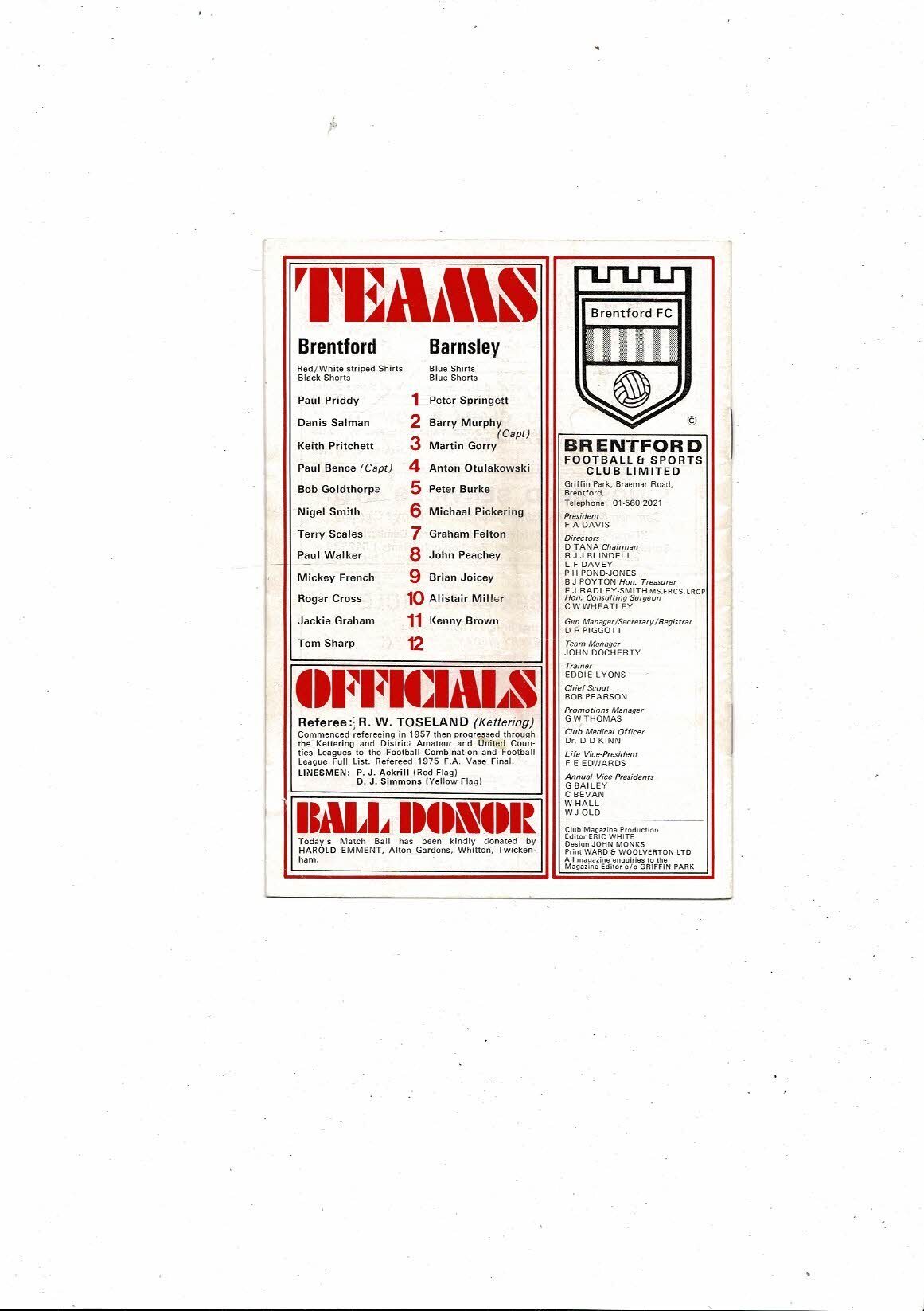 1976/77 Brentford v Barnsley Football Programme