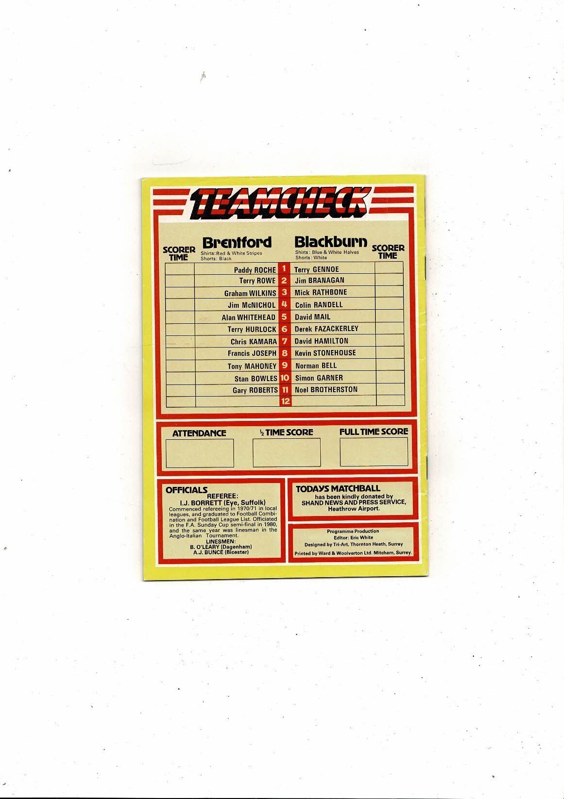 1982/83 Brentford v Blackburn Rovers League Cup Football Programme