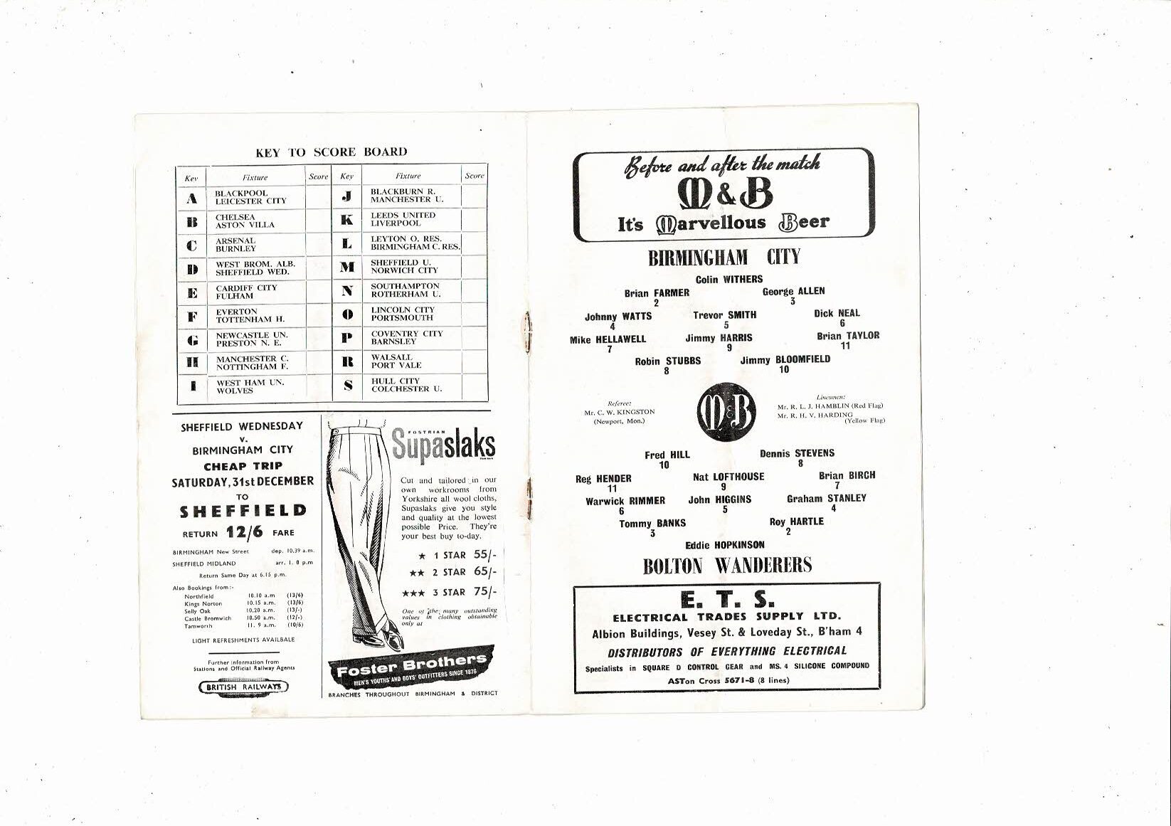 1960/61 Birmingham City v Bolton Wanderers Football Programme