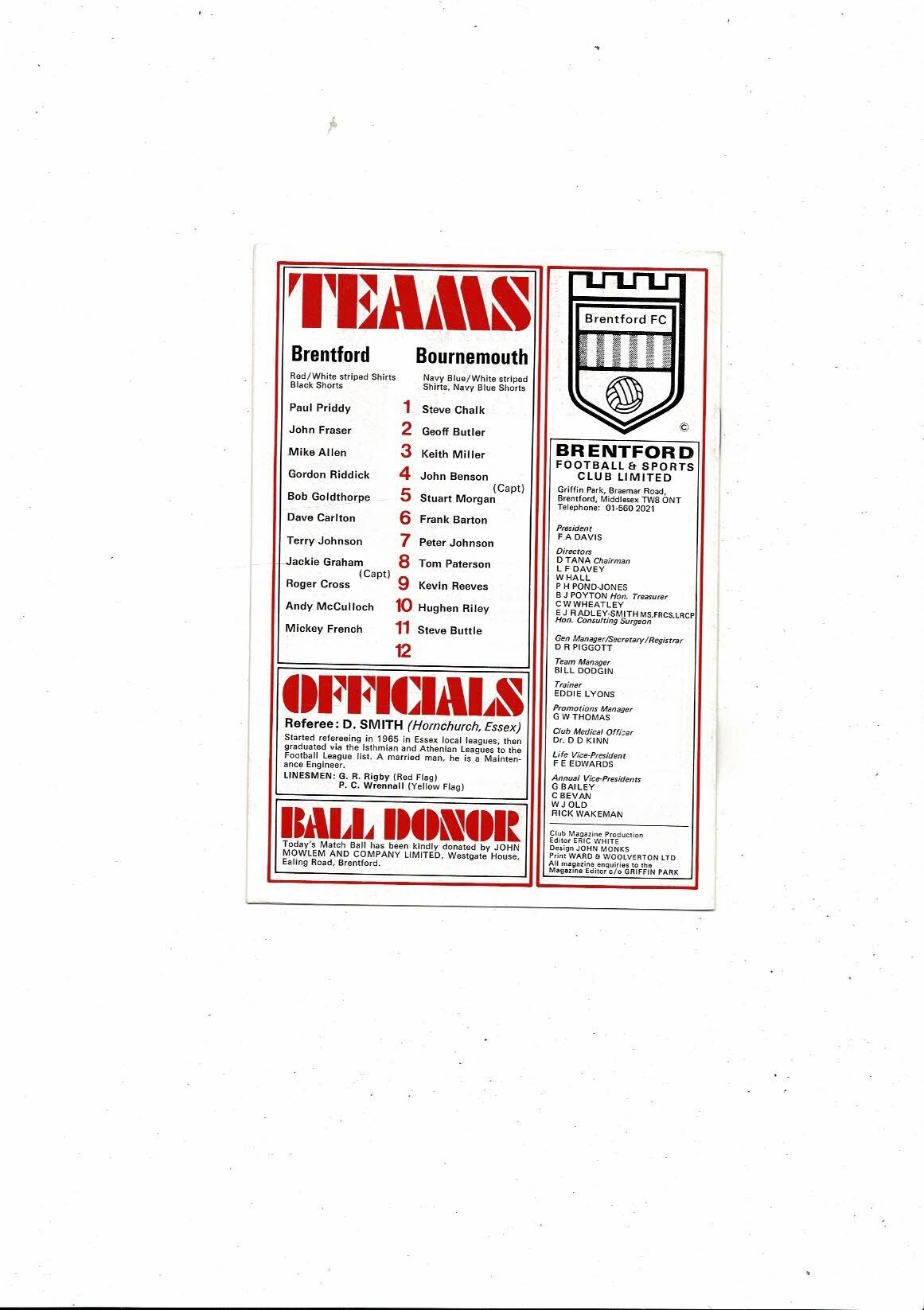 1976/77 Brentford v Bournemouth Football Programme
