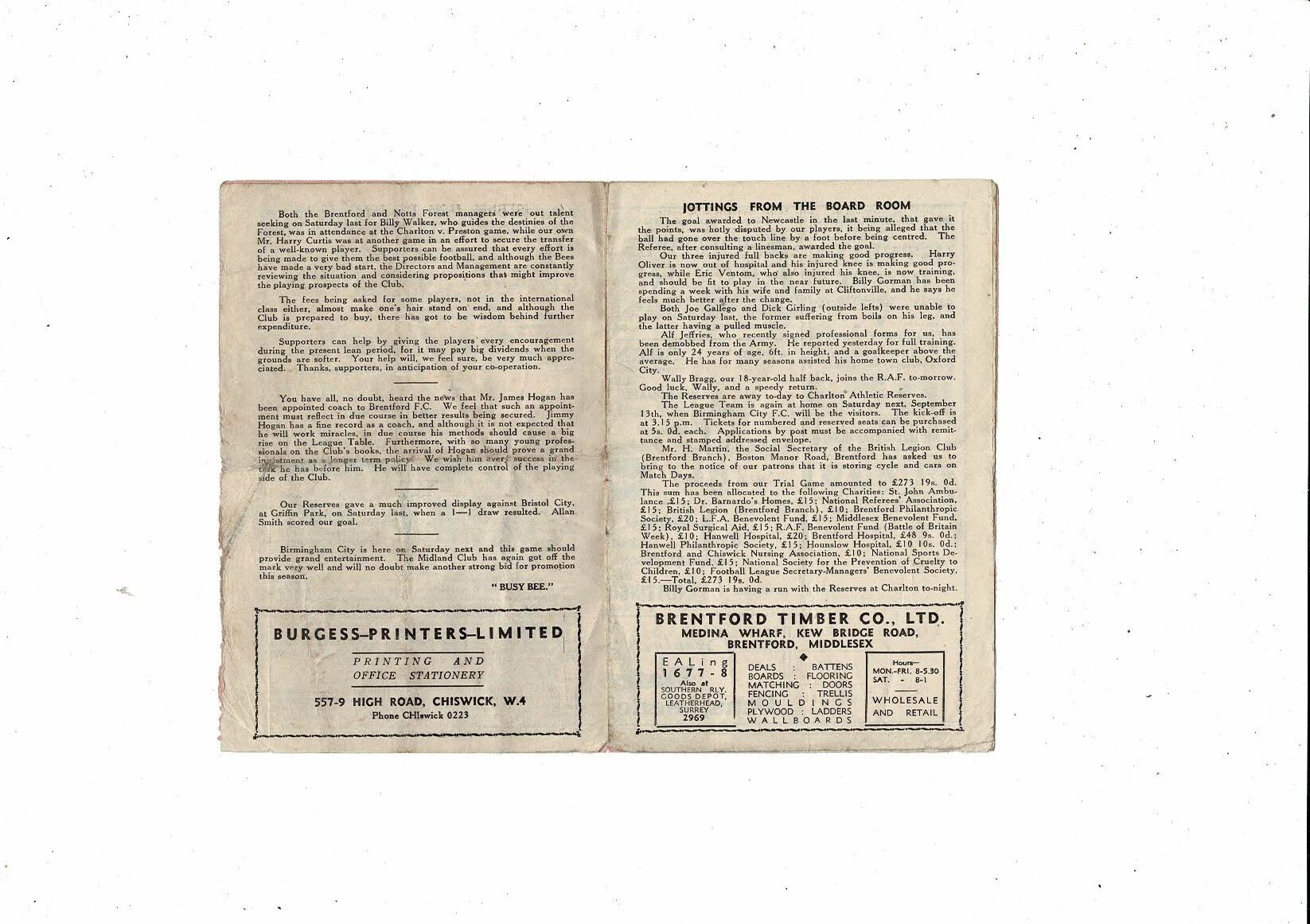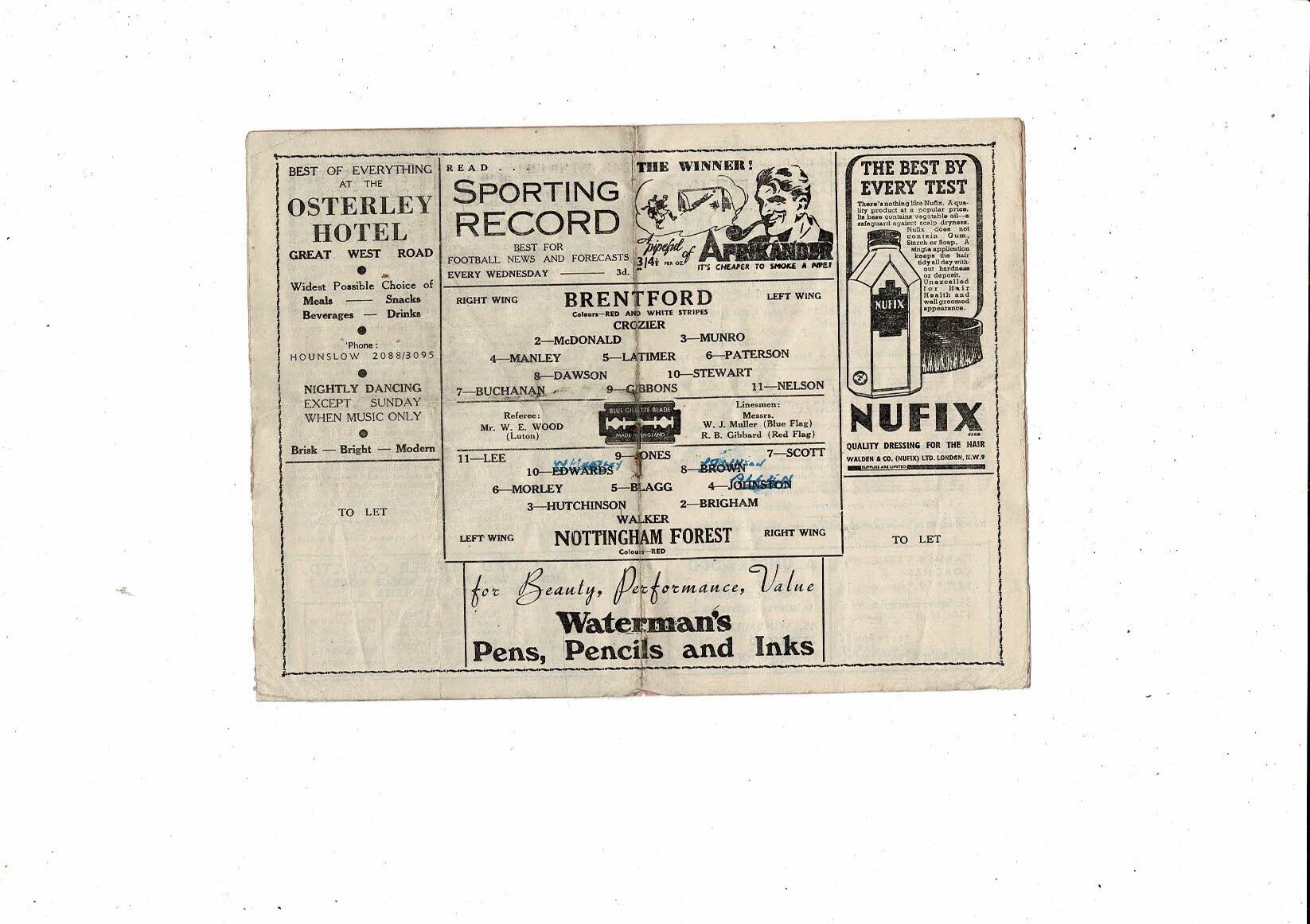 1947/48 Brentford v Nottingham Forest Football Programme