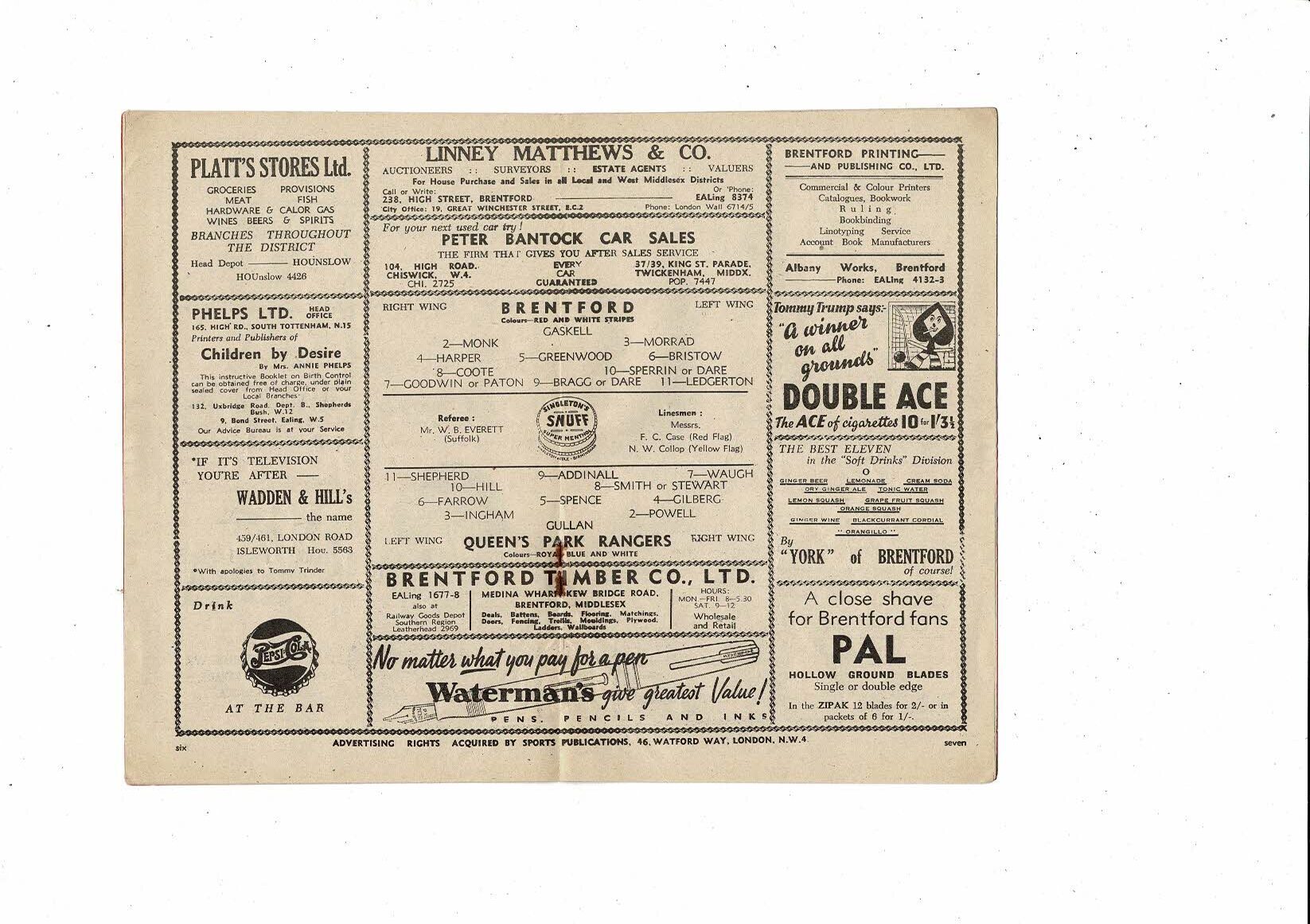 1951/52 Brentford v Queens Park Rangers Football Programme