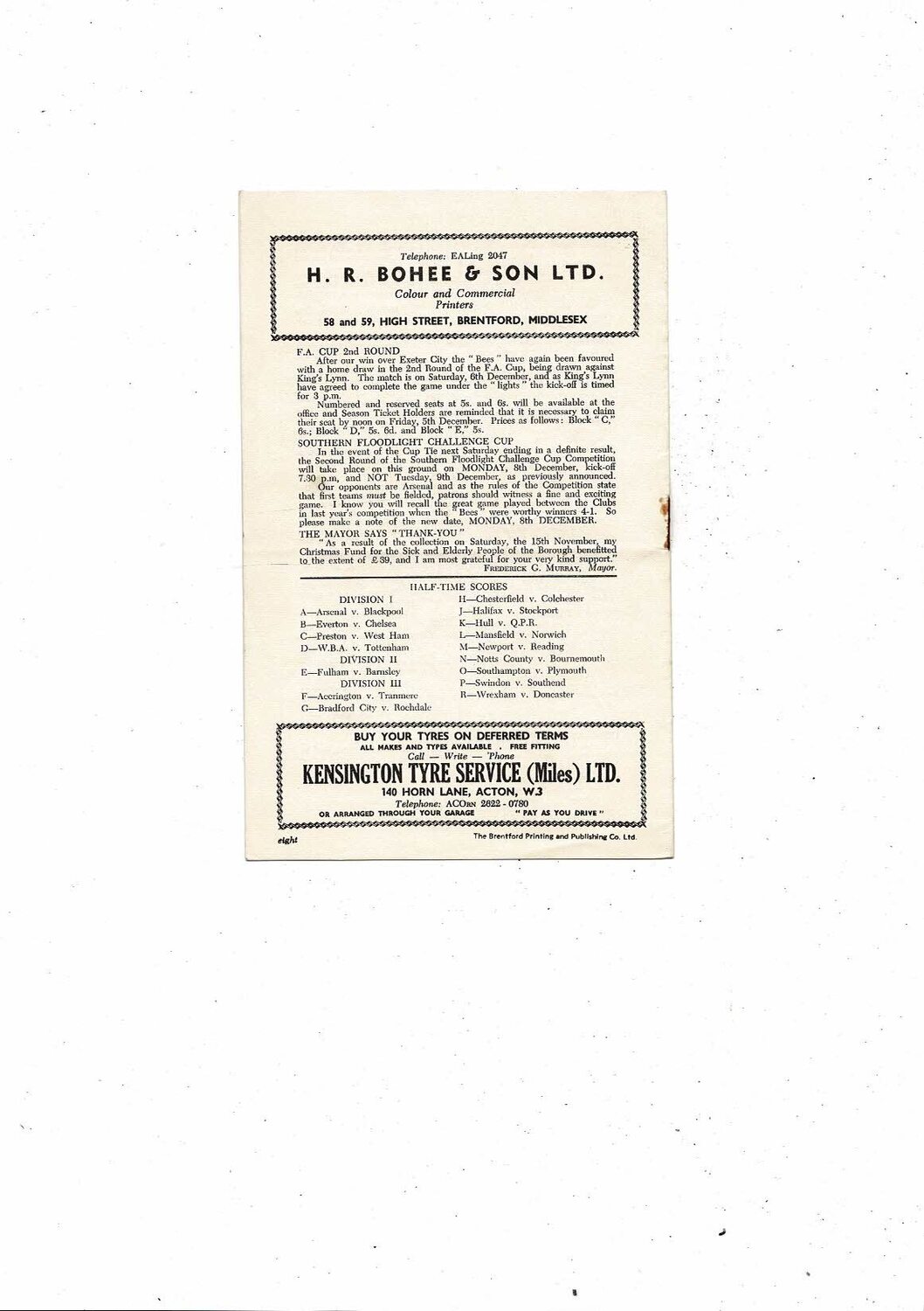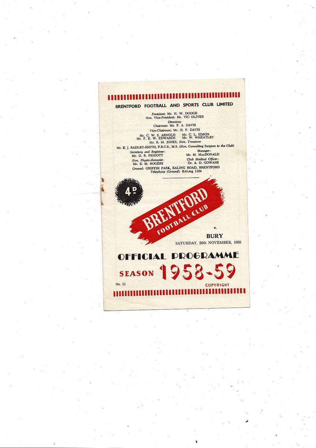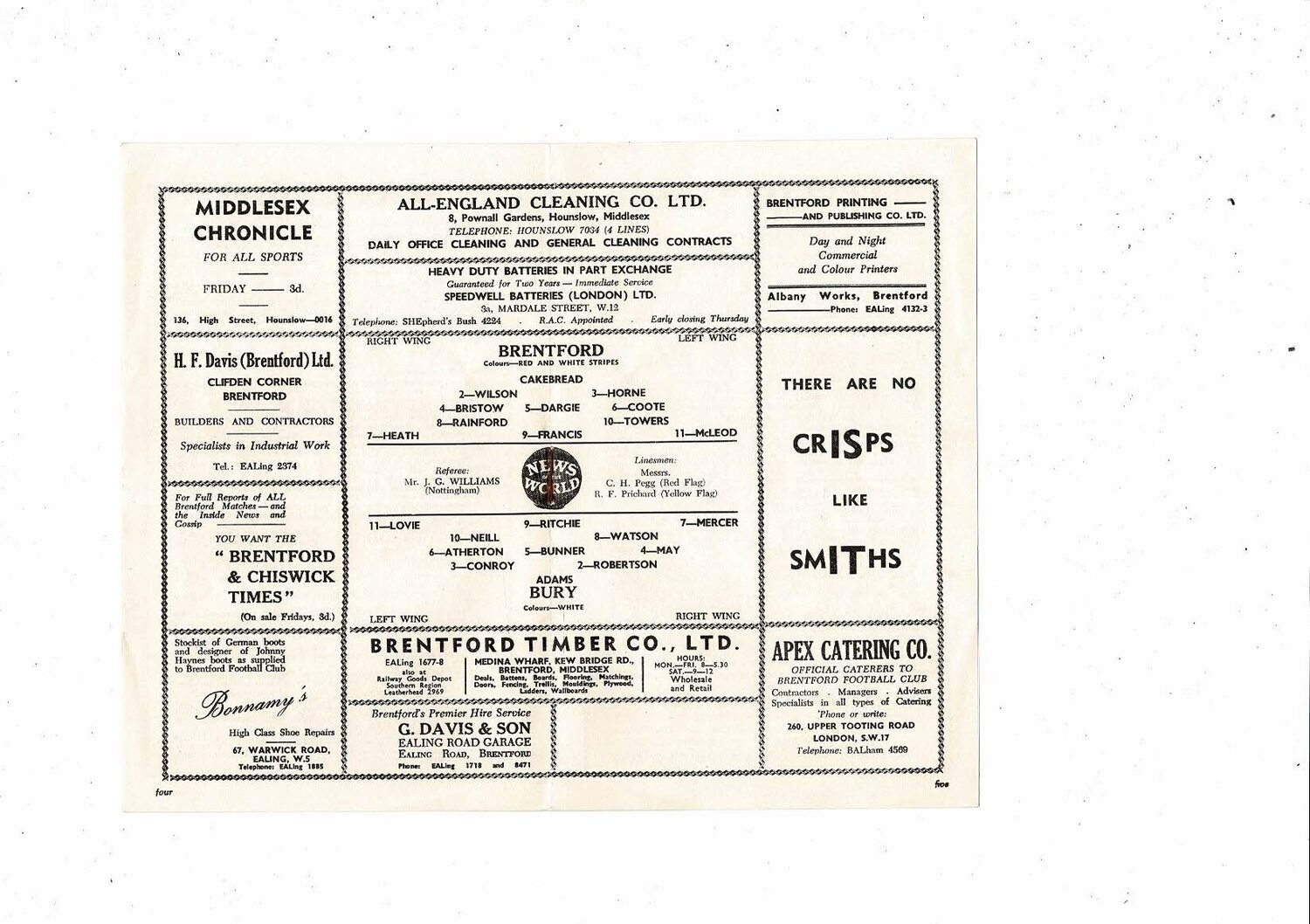 1958/59 Brentford v Bury Football Programme