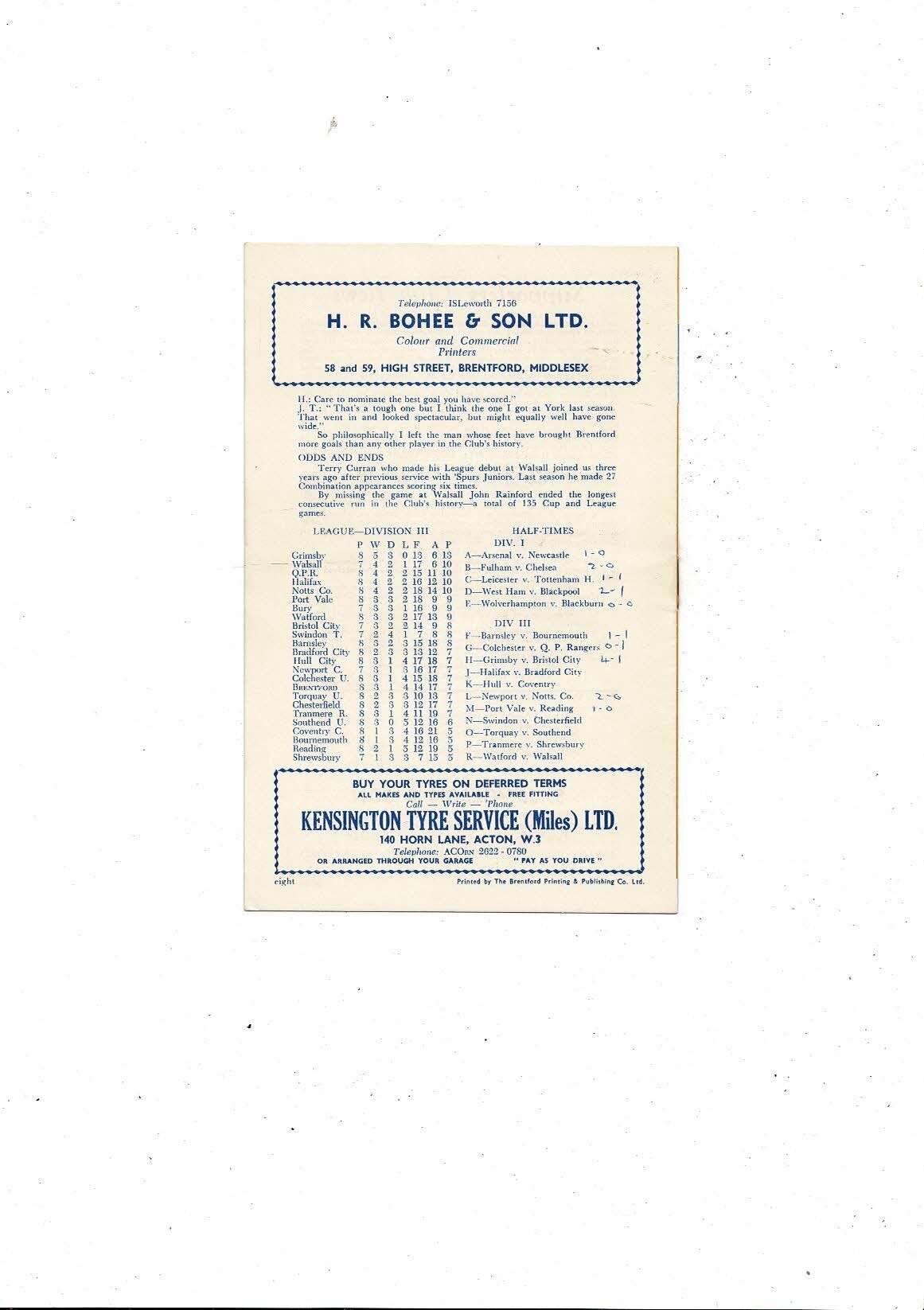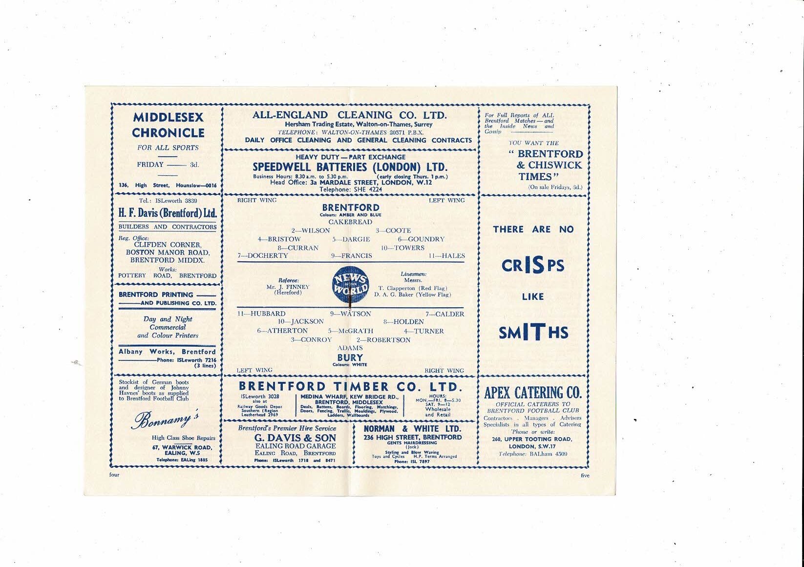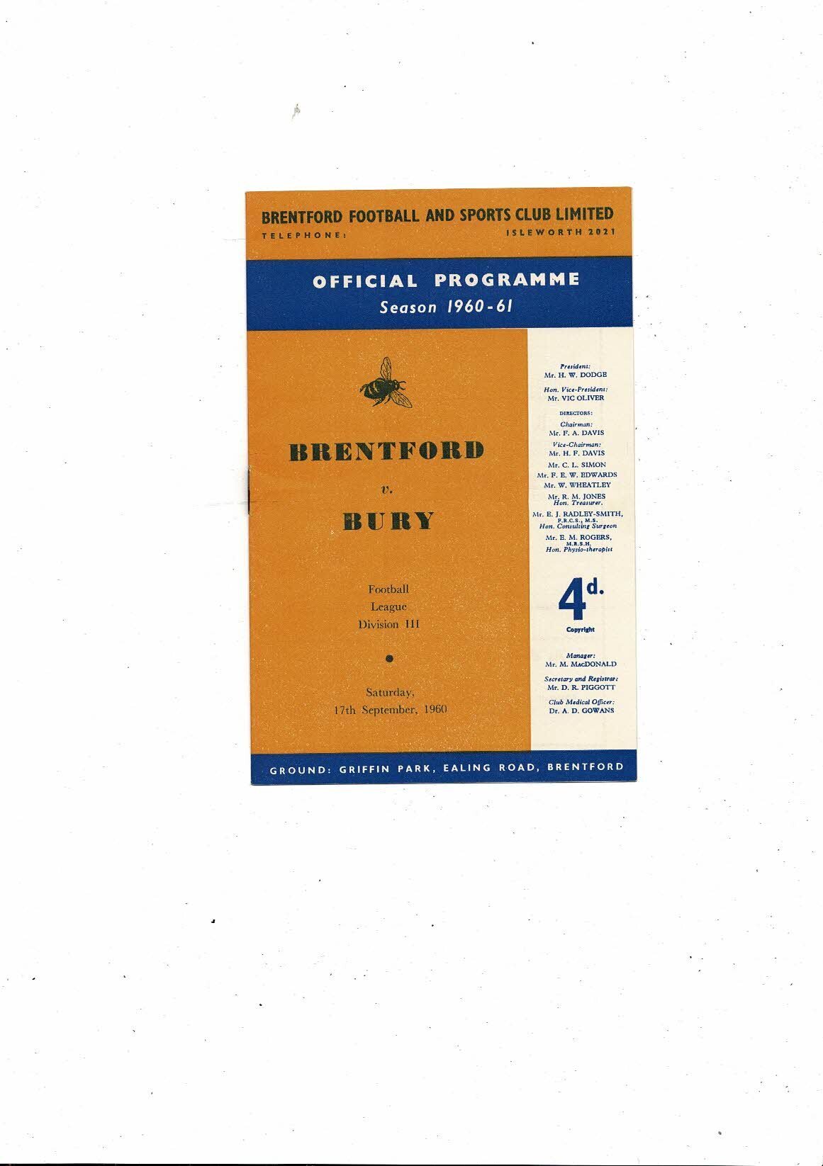 1960/61 Brentford v Bury Football Programme