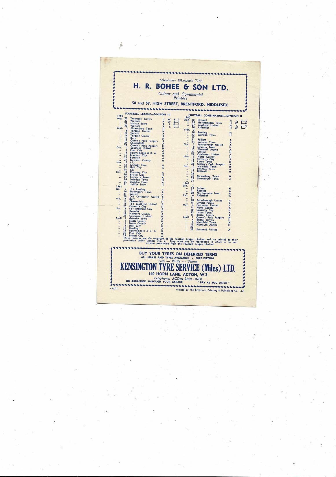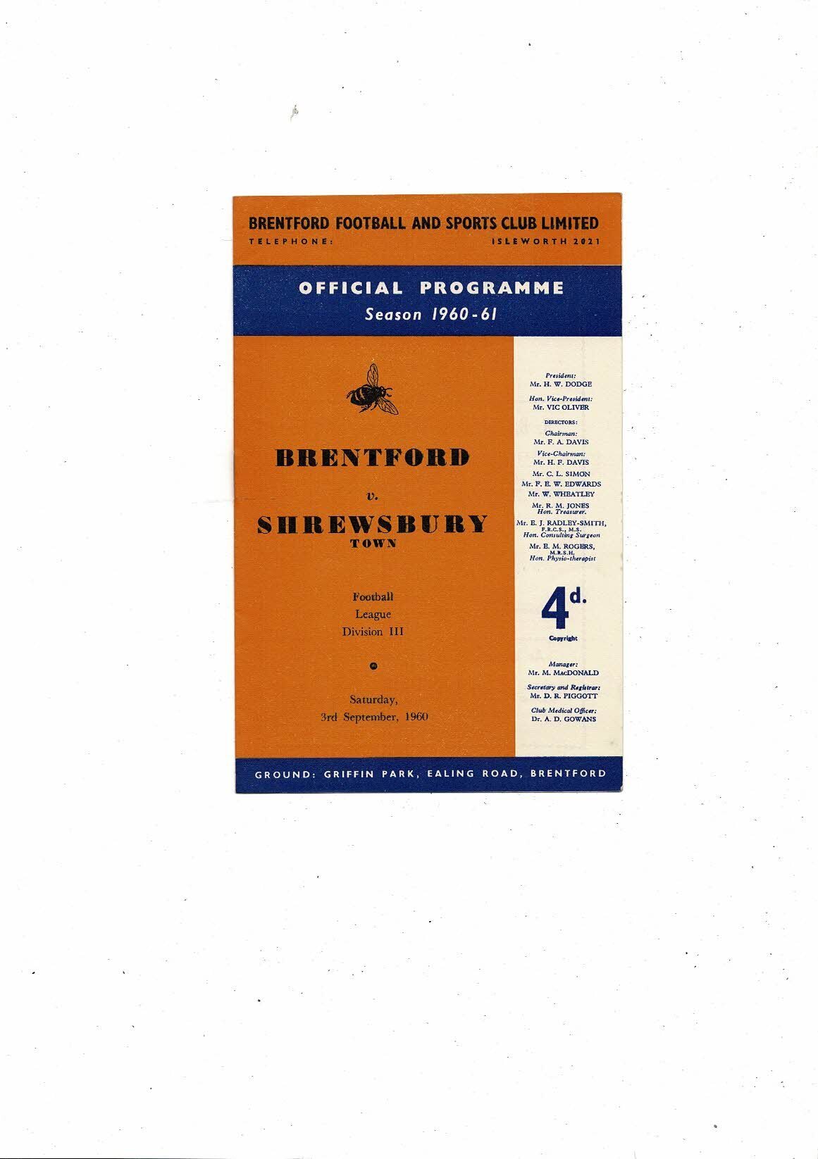 1960/61 Brentford v Shrewsbury Town Football Programme.