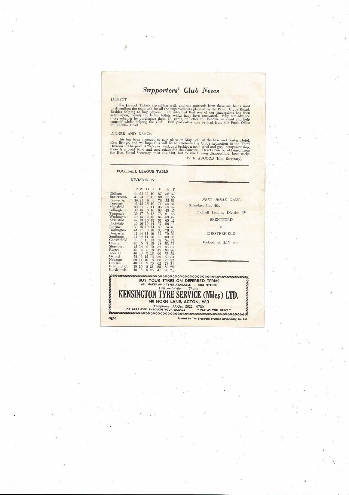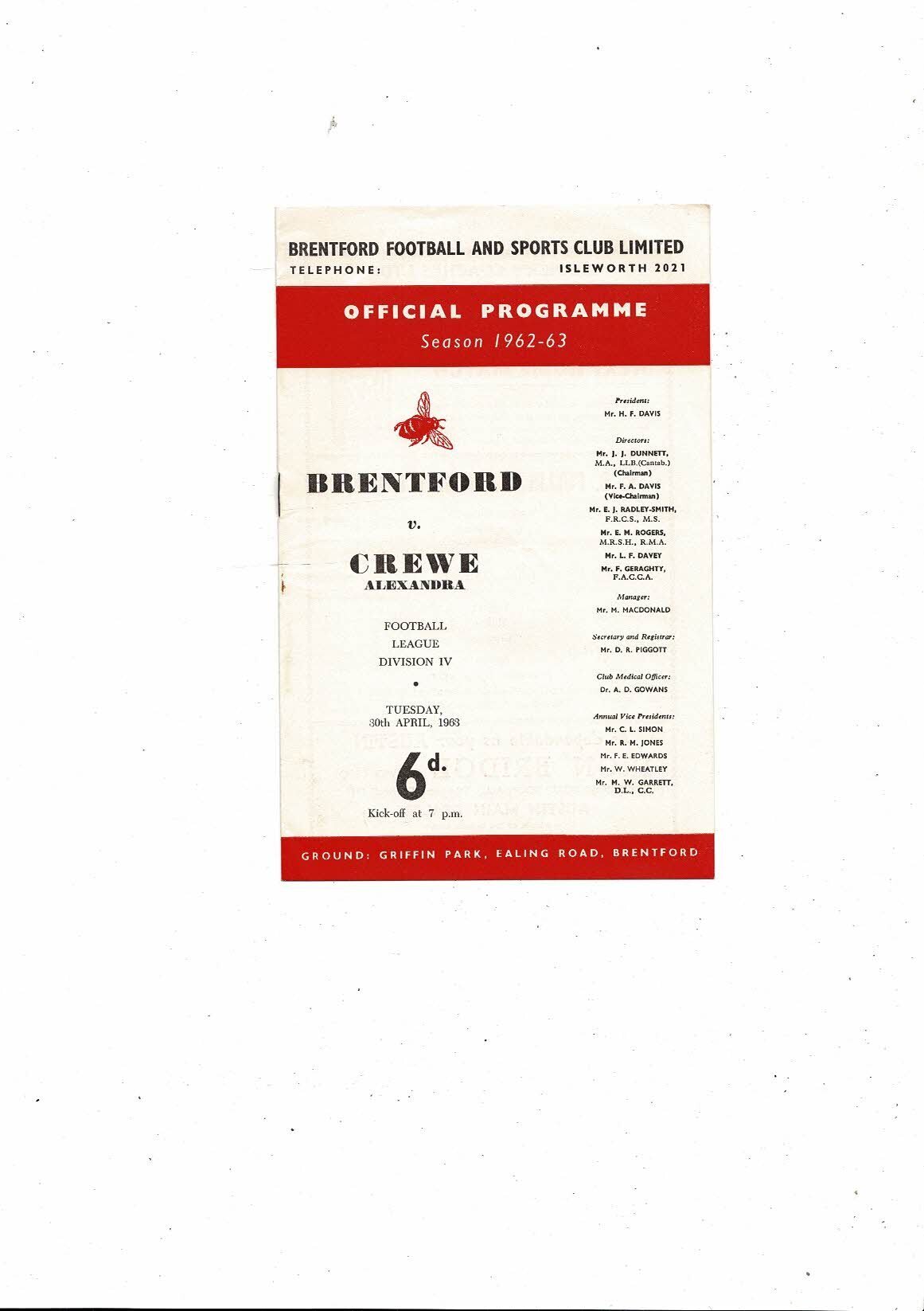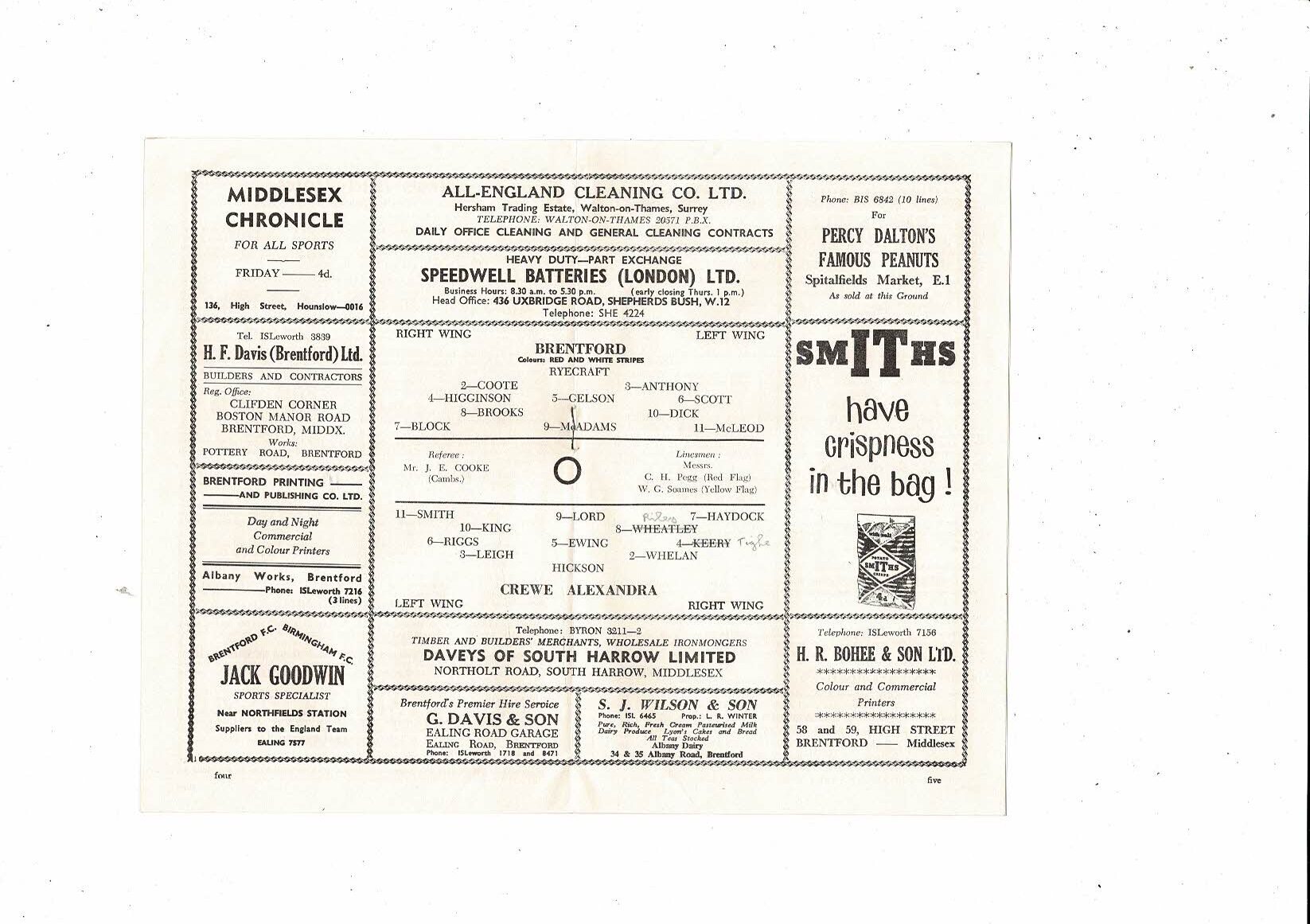 1962/63 Brentford v Crewe Alexandra Football Programme