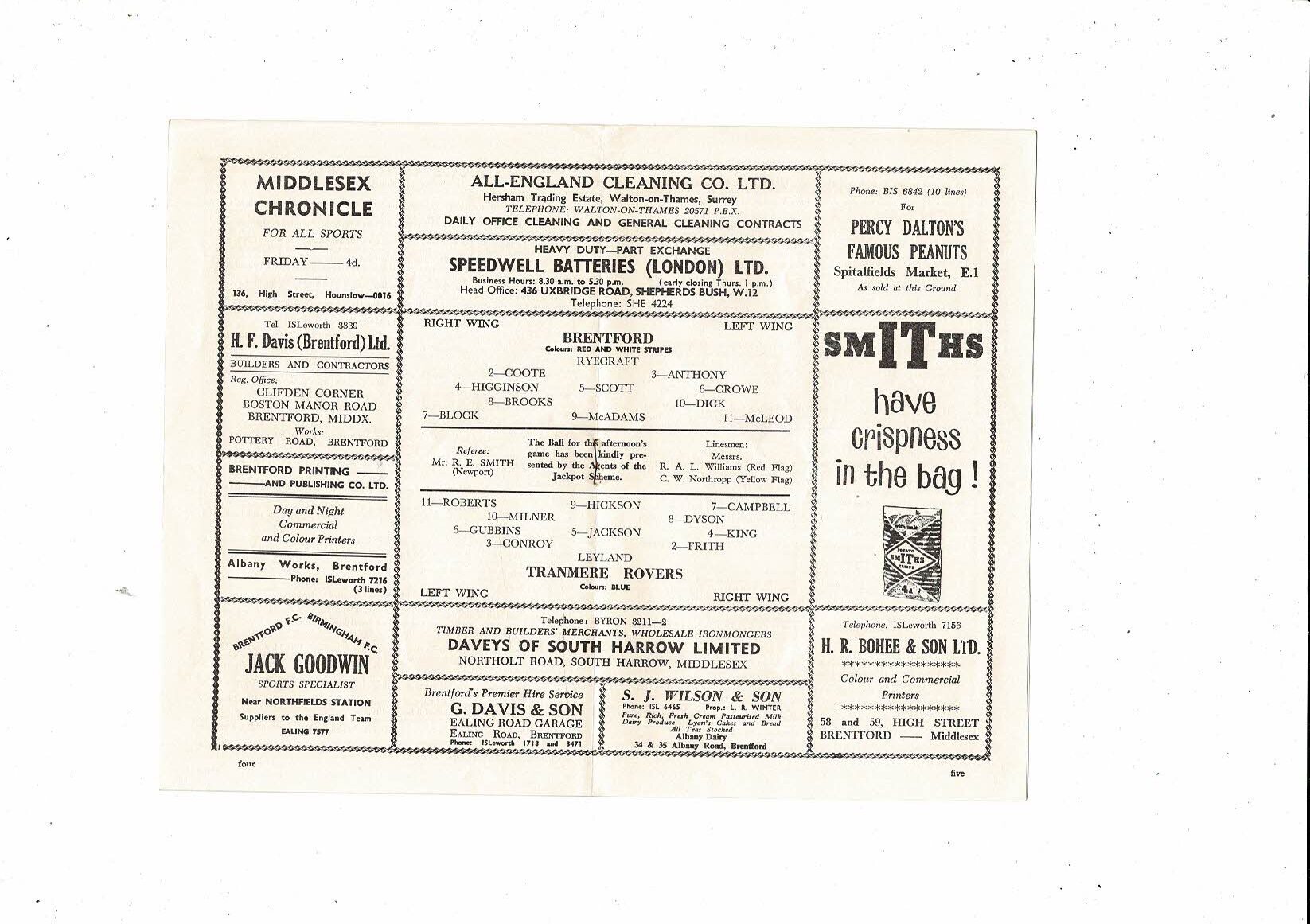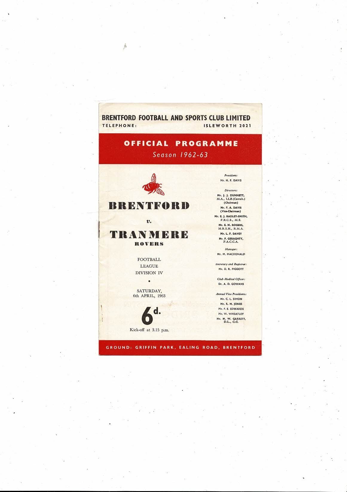 1962/63 Brentford v Tranmere Rovers Football Programme