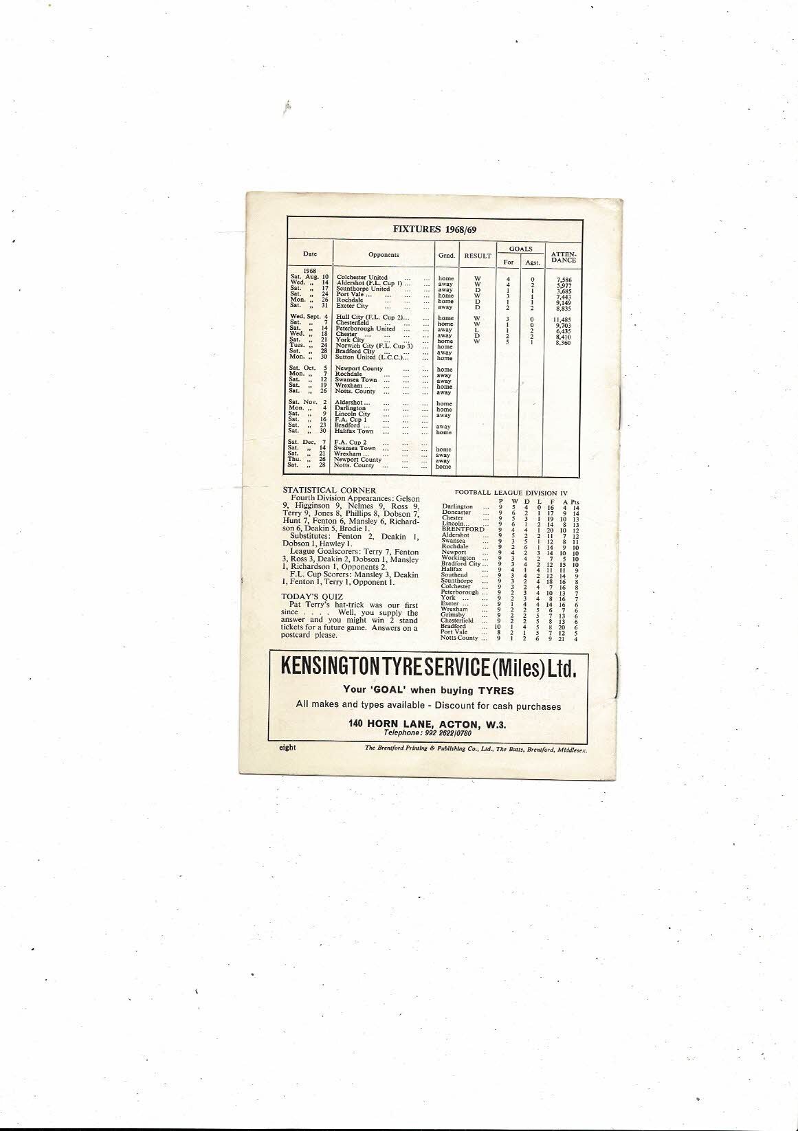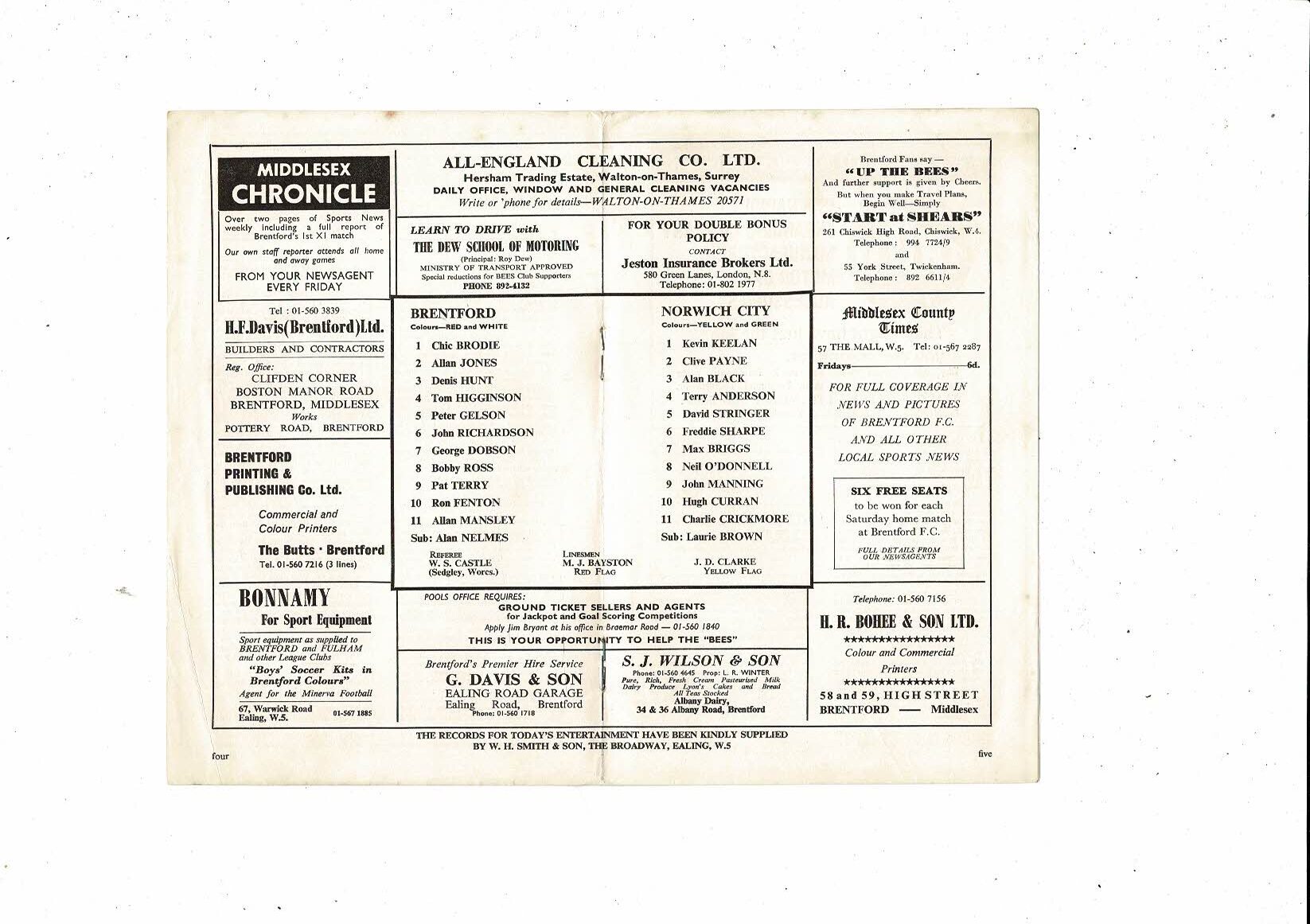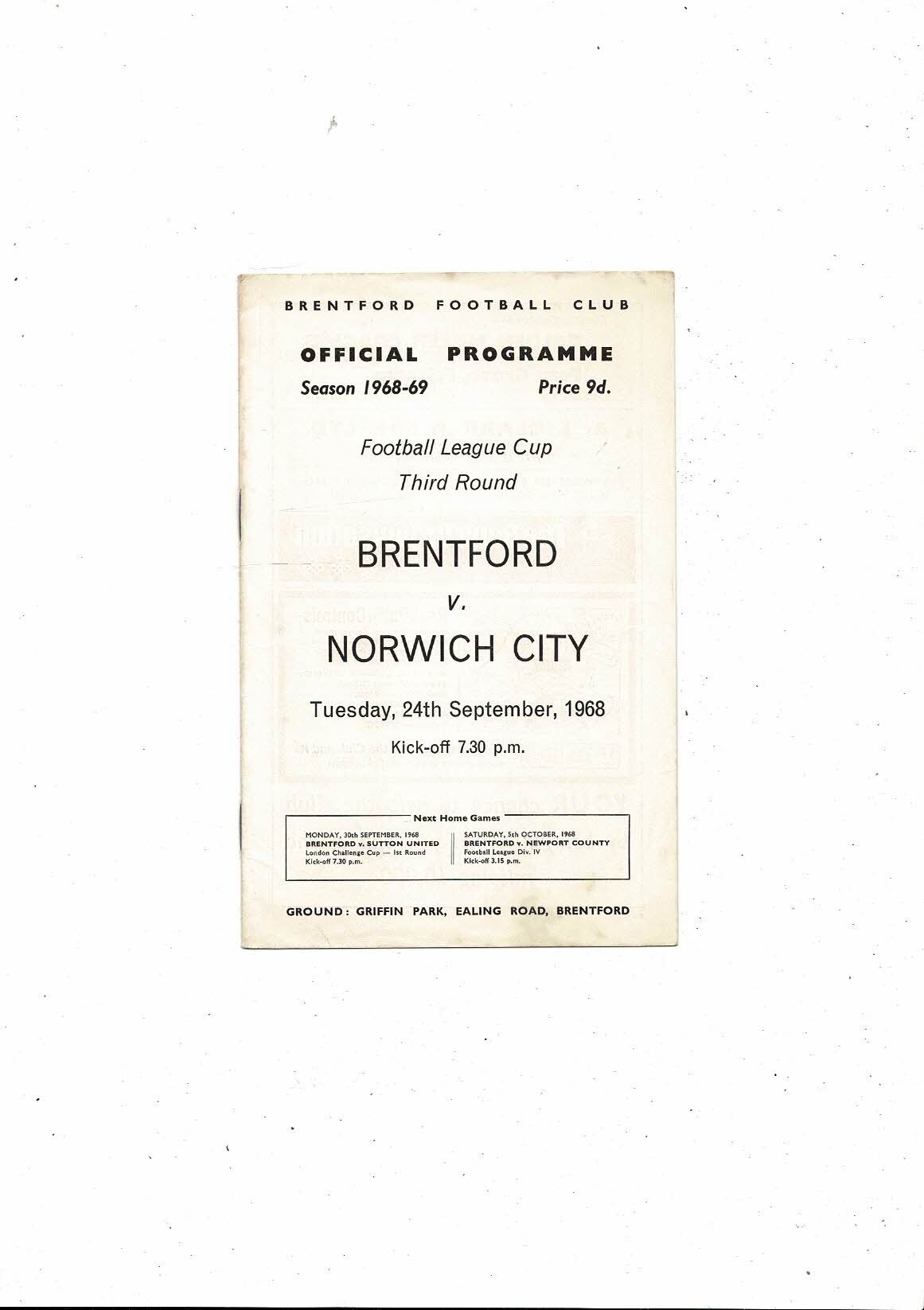1968/69 Brentford v Norwich City League Cup Football Programme