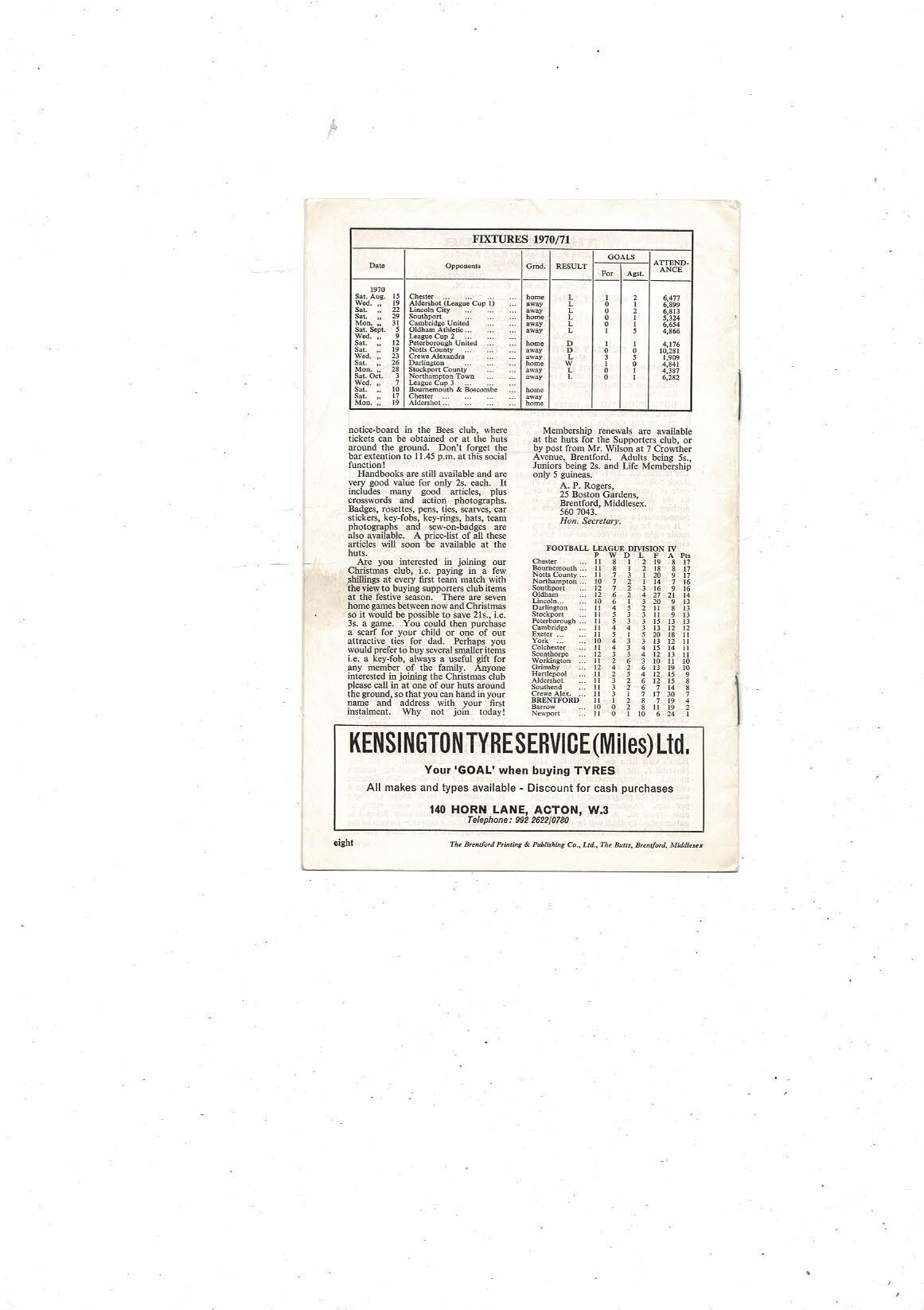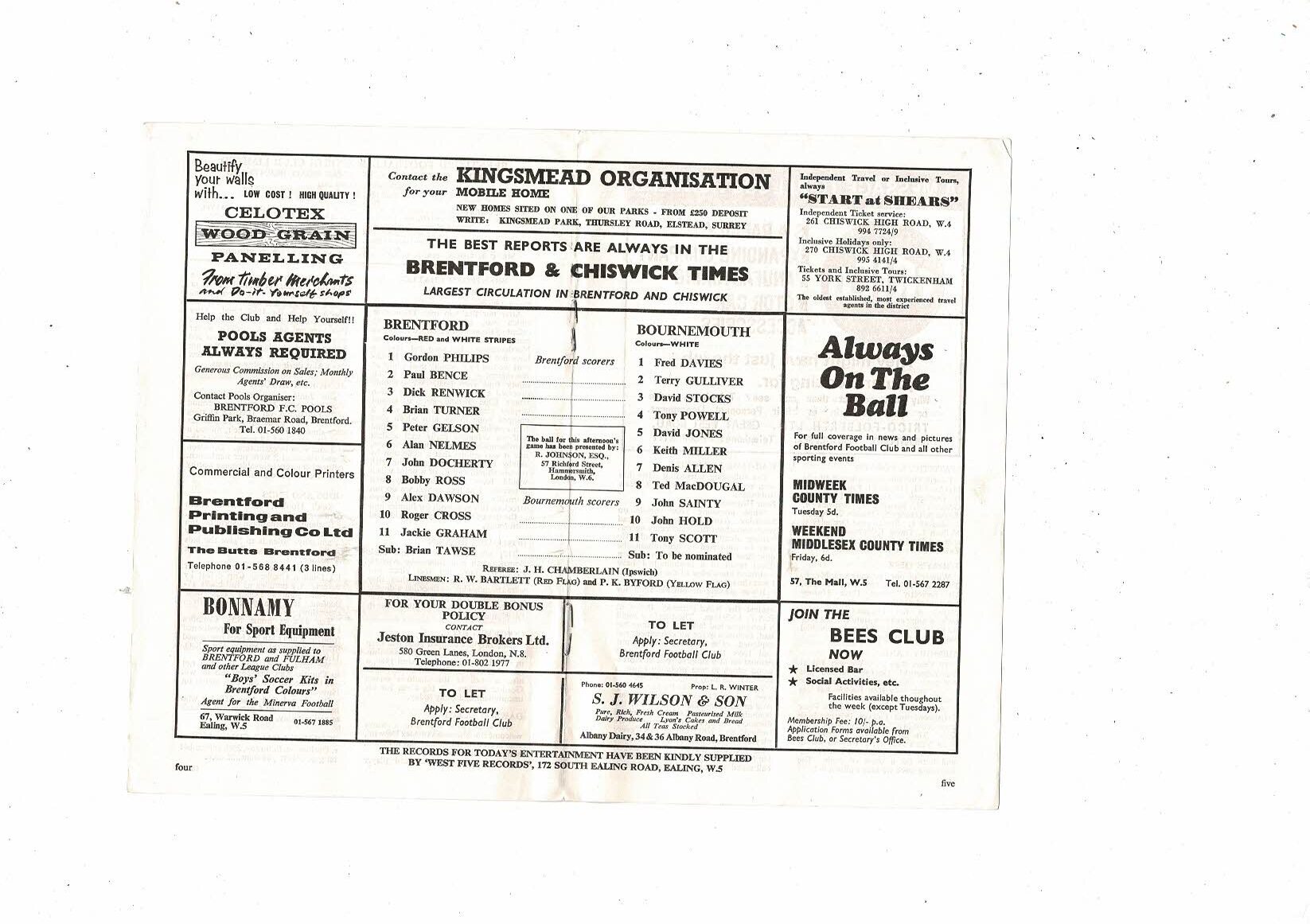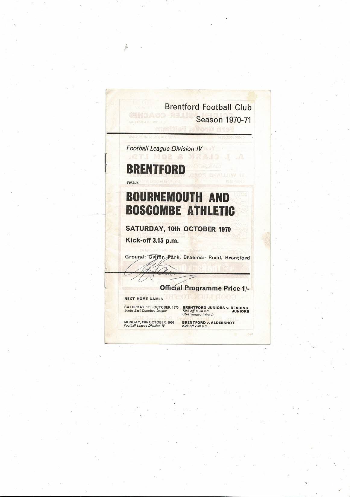 1970/71 Brentford v Bournemouth Football Programme. Autographed