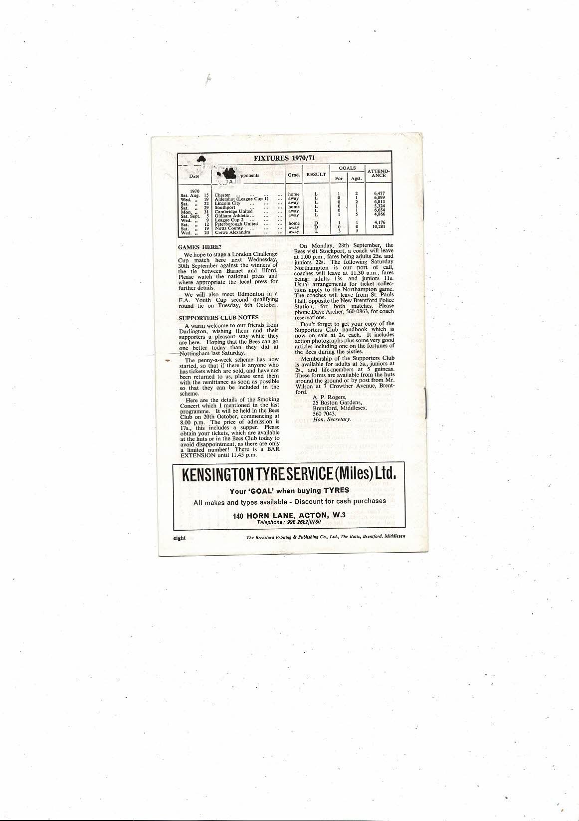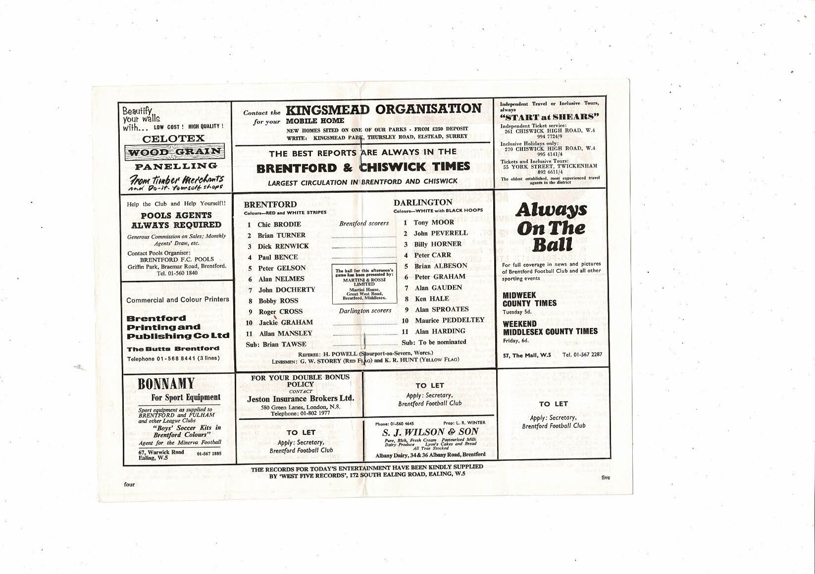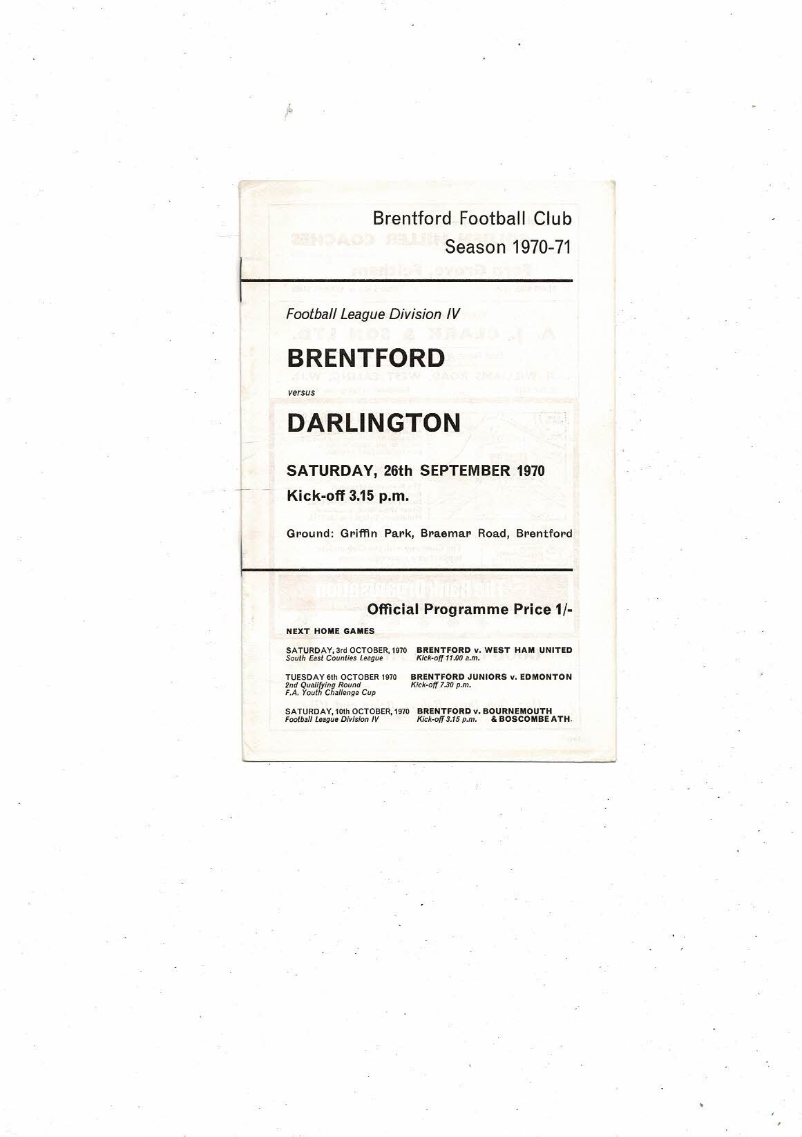 1970/71 Brentford v Darlington Football Programme