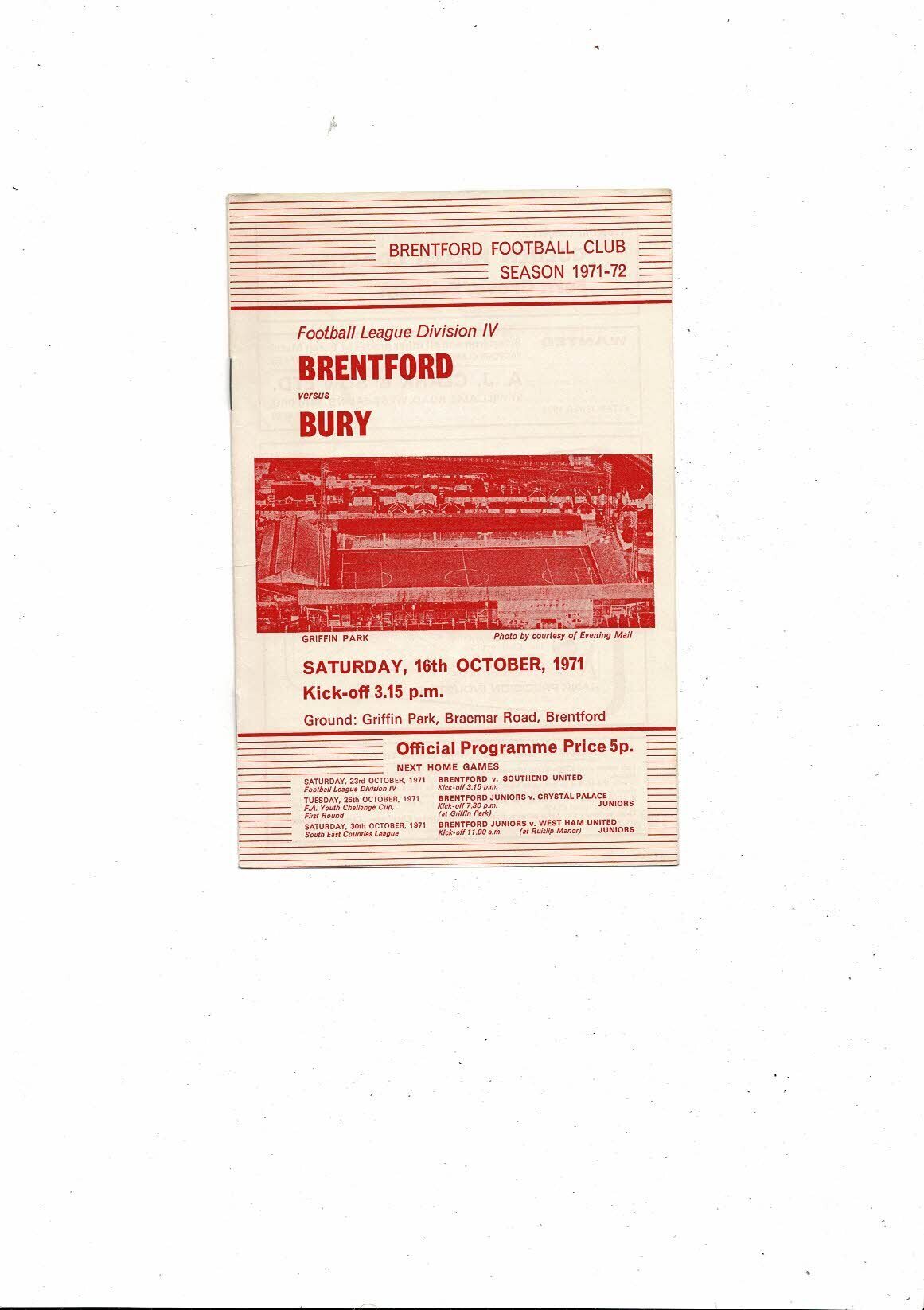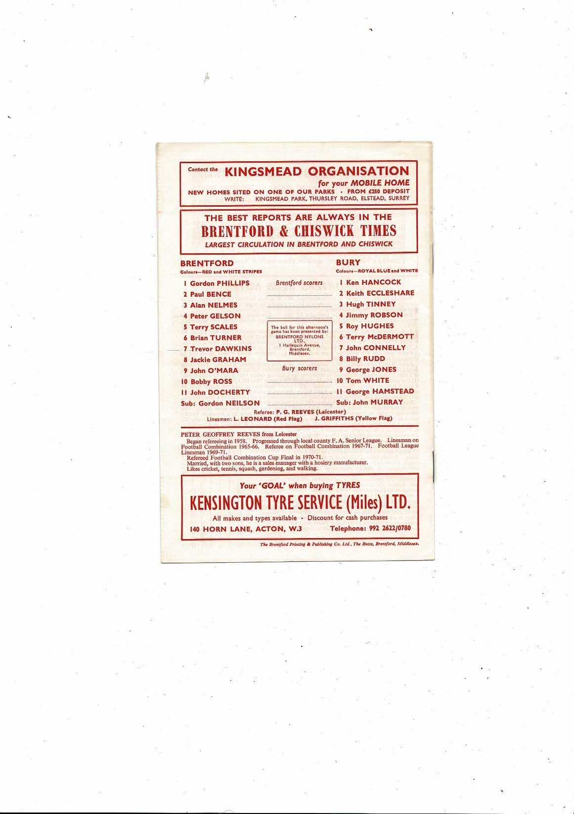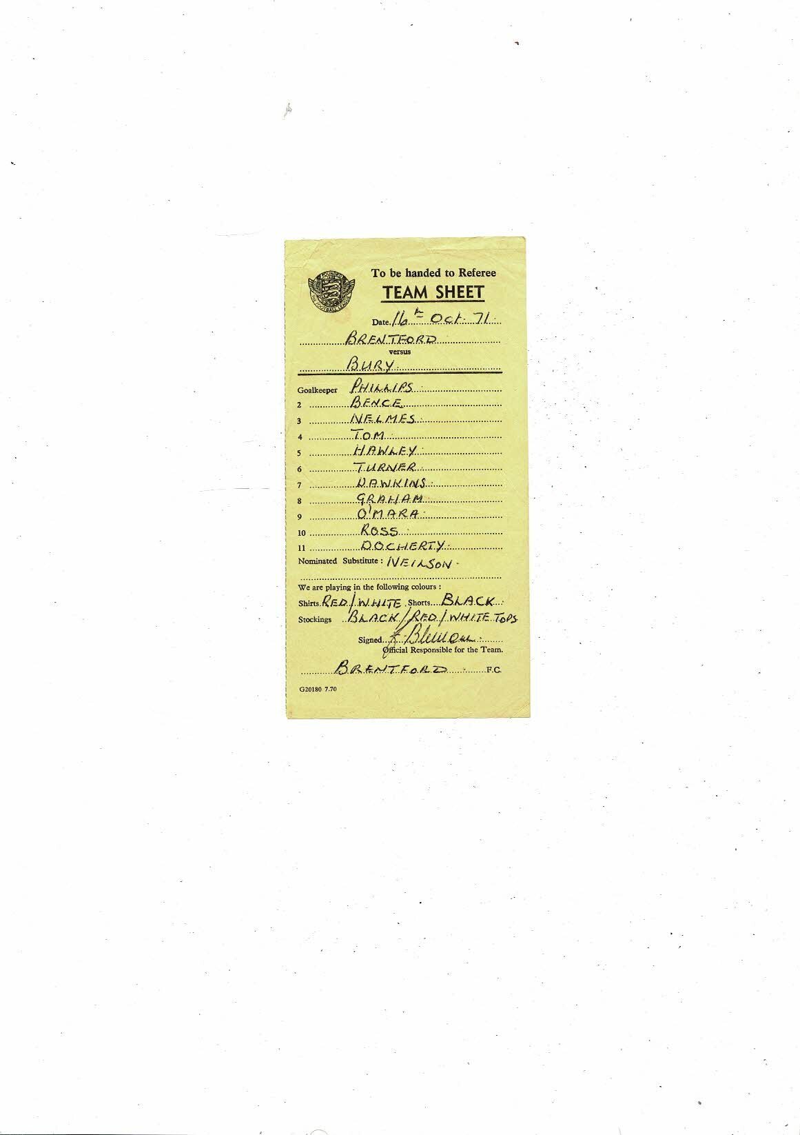 Also has the official Brentford Team sheet which is creased with small tear & small mark on back. Please see scans.