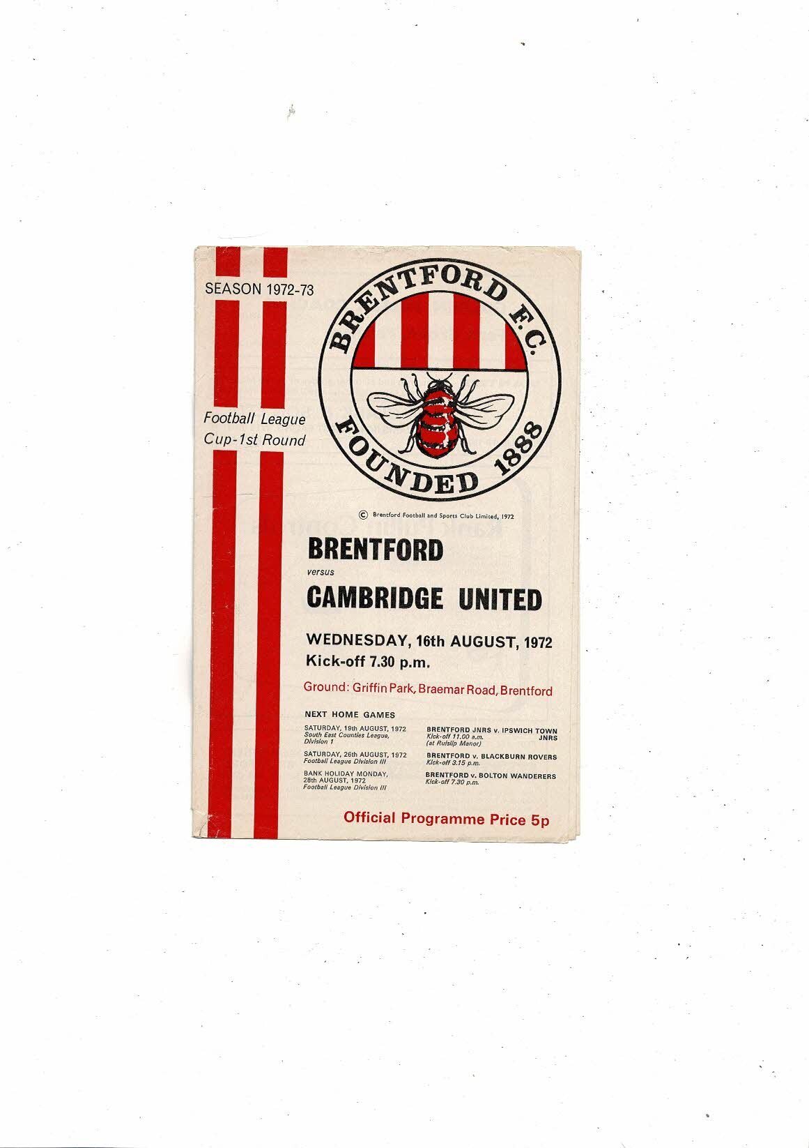 1972/73 Brentford v Cambridge United League Cup Football Programme