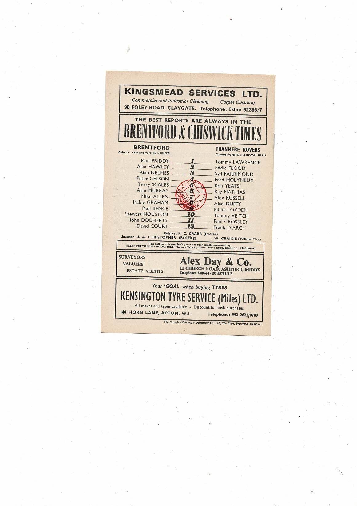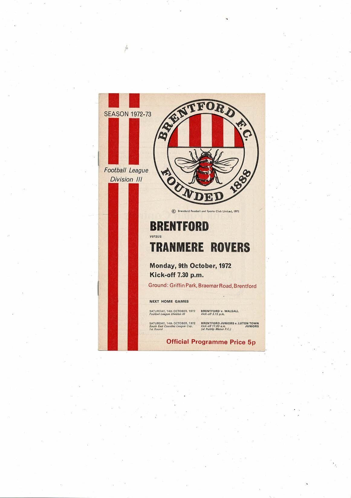 1972/73 Brentford v Tranmere Rovers Football Programme
