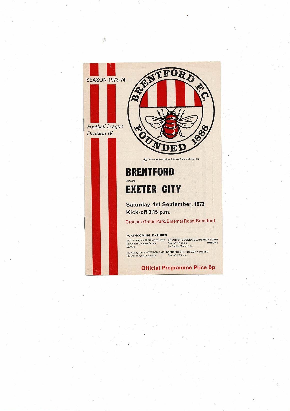 1973/74 Brentford v Exeter City Football Programme