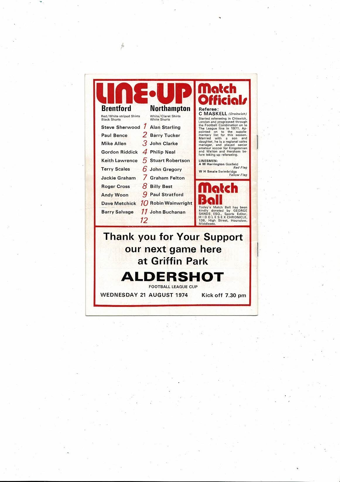1974/75 Brentford v Northampton Town Football Programme