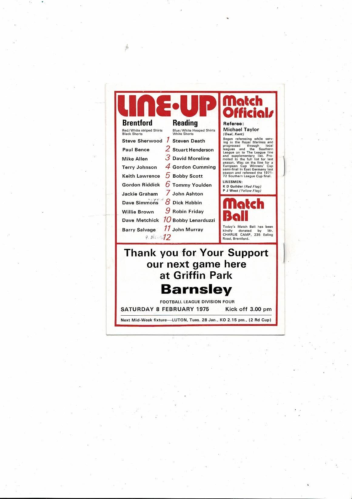 1974/75 Brentford v Reading Football Programme