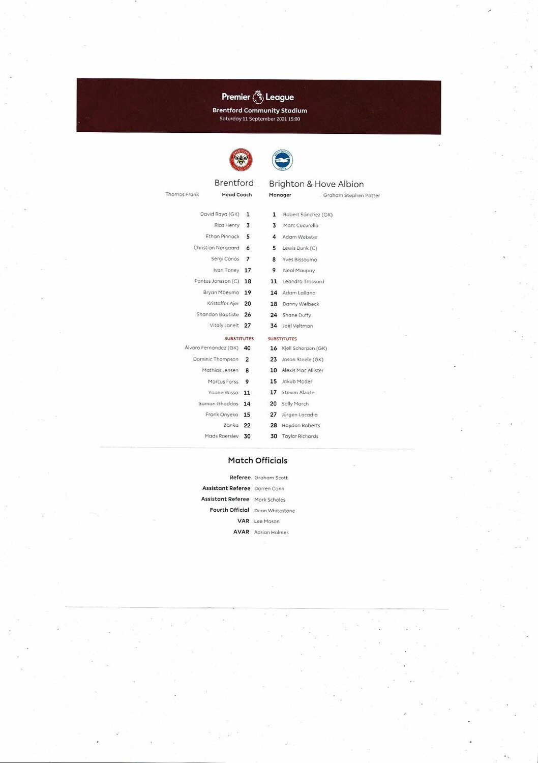 2021/22 Brentford v Brighton Football Programme + Team Sheet