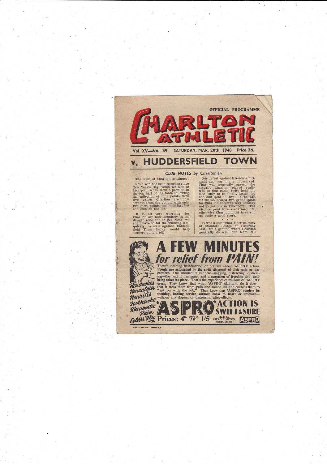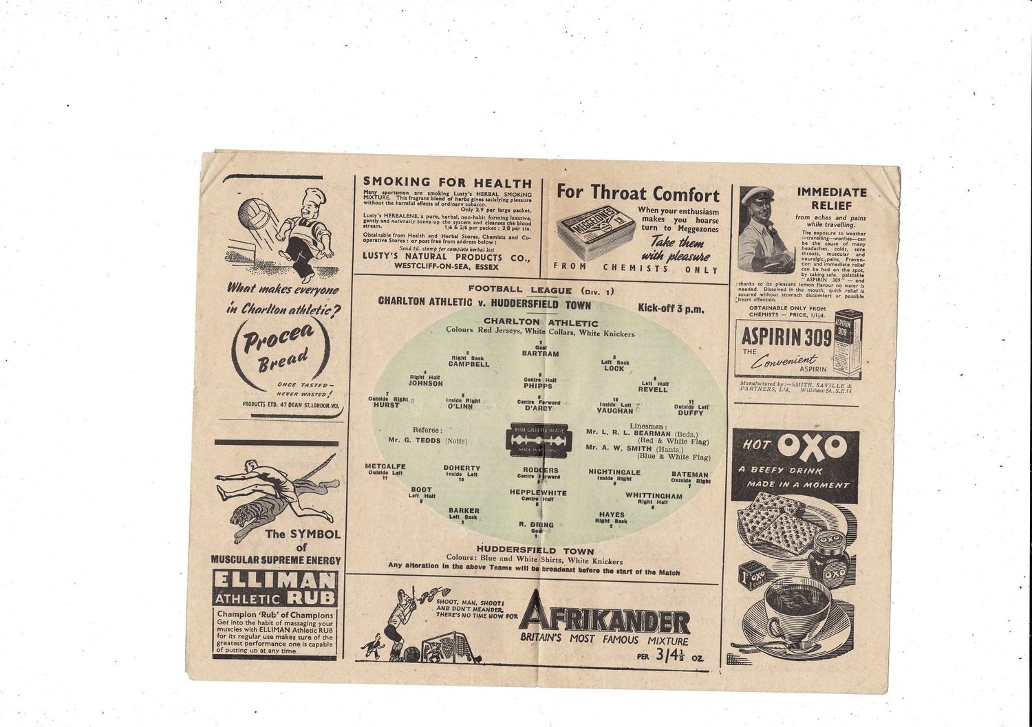 1947/48 Charlton Athletic v Huddersfield Town Football Programme