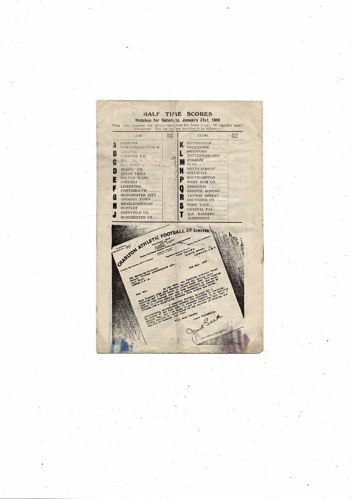 1947/48 Charlton Athletic v Stoke City Football Programme
