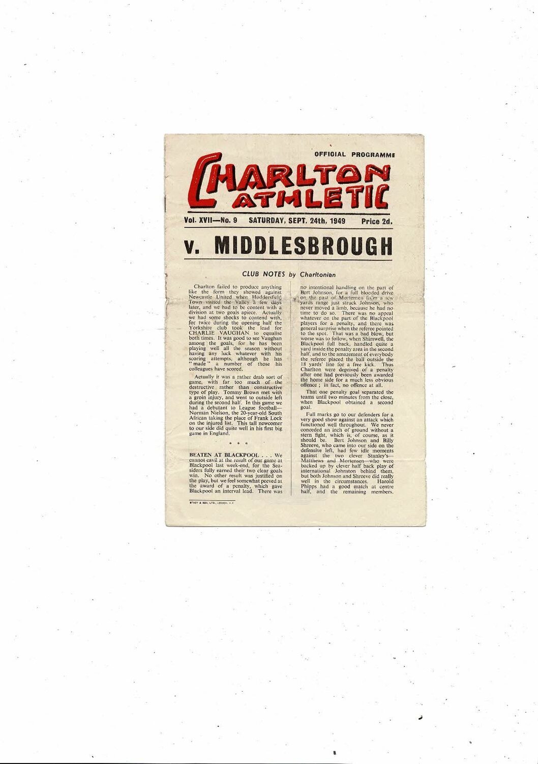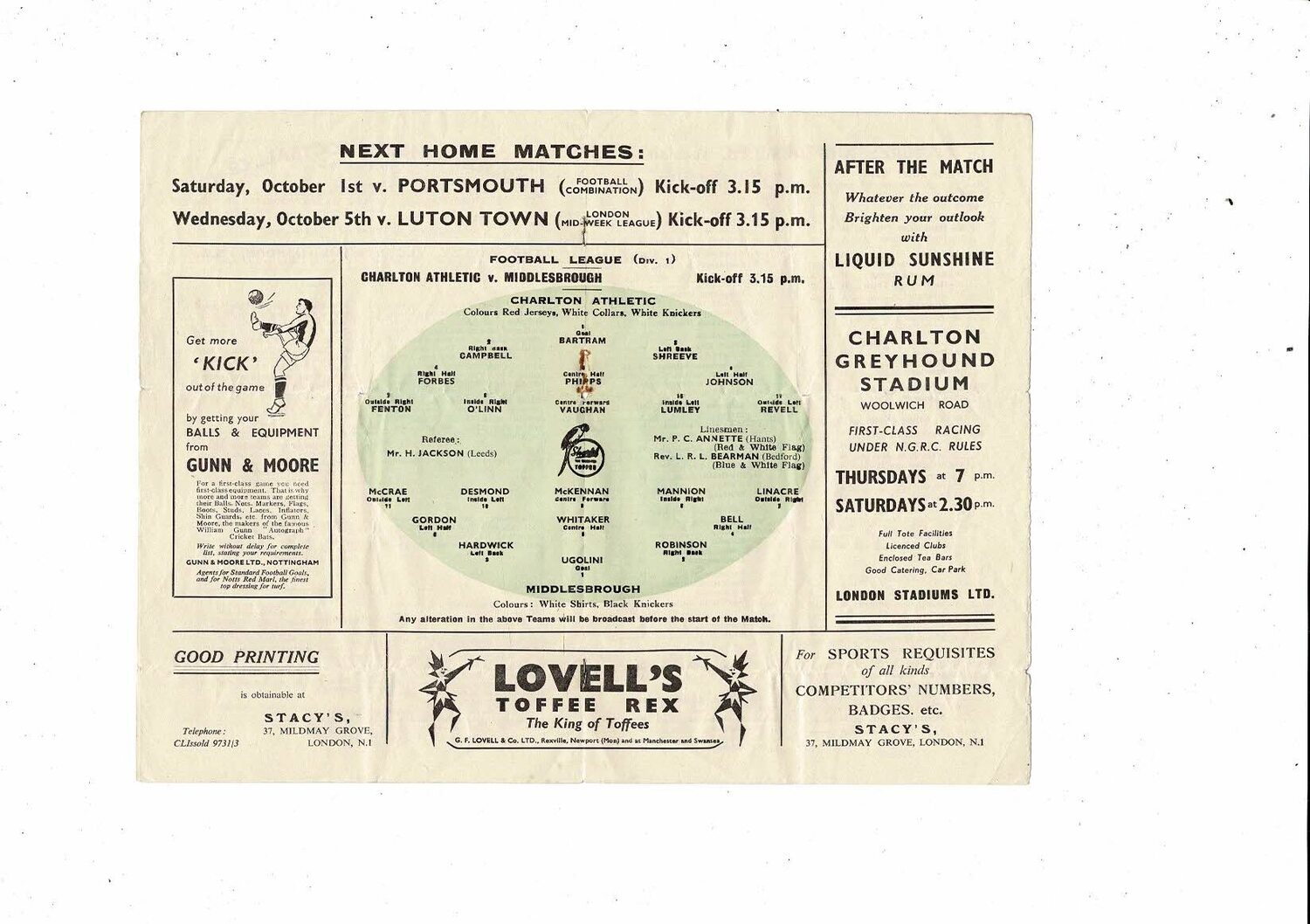 1949/50 Charlton Athletic v Middlesbrough Football Programme