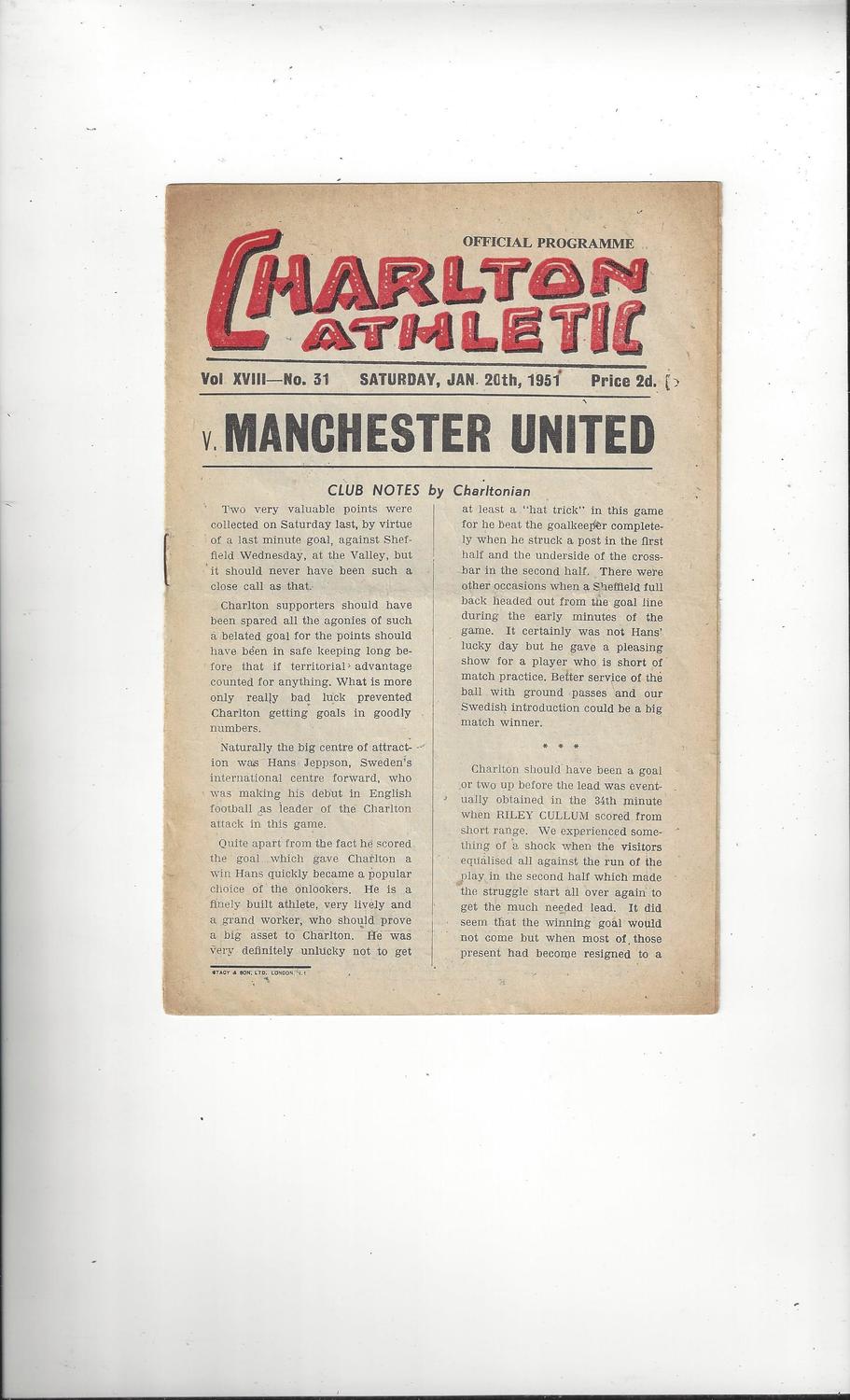 1950/51 Charlton Athletic v Manchester United Football Programme