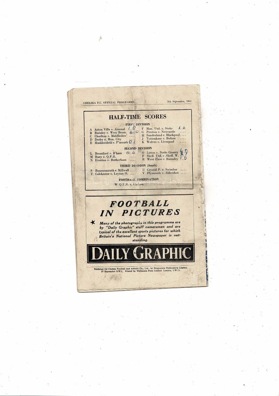 This Original Football Programme is creased, folded & stained with several small tears, rusty staples, team chages & some results noted. Please see scans.