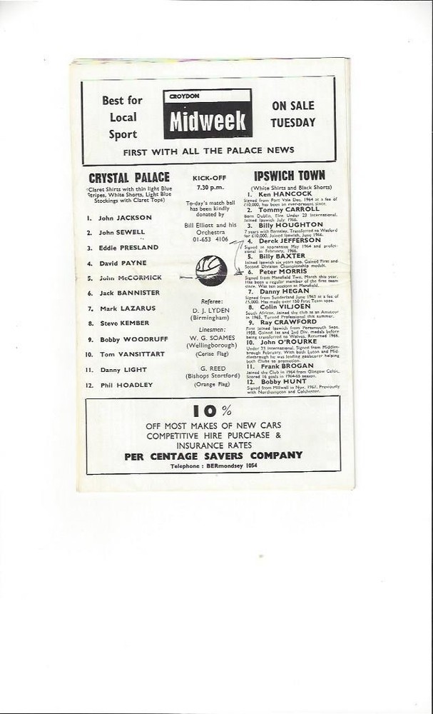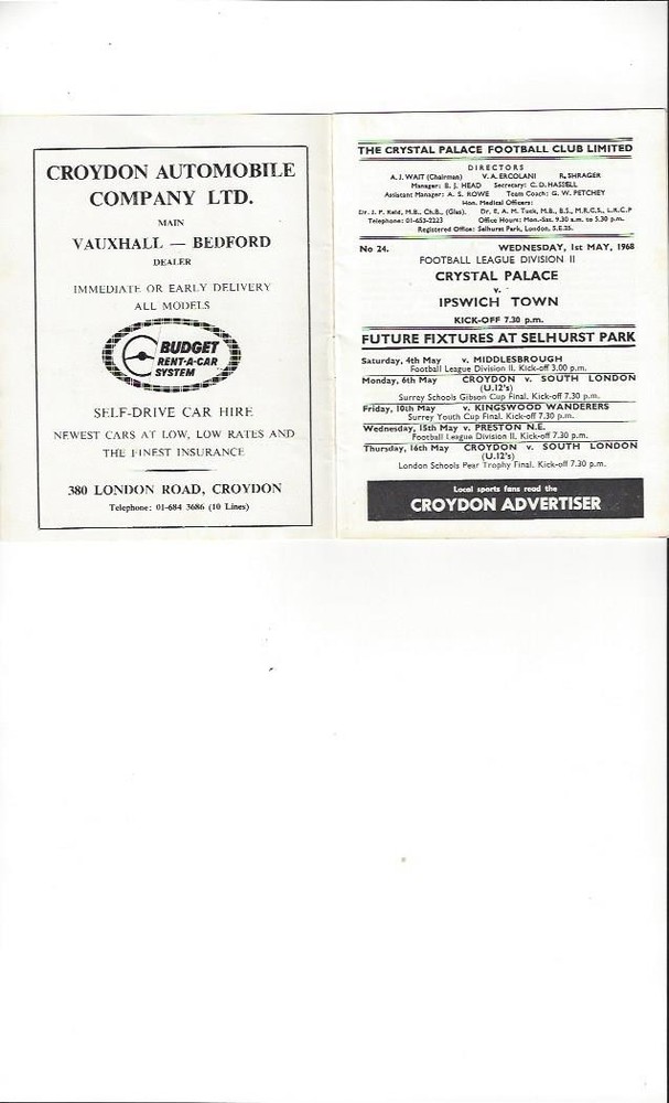 1967/68 Crystal Palace v Ipswich Town Football Programme May 1st