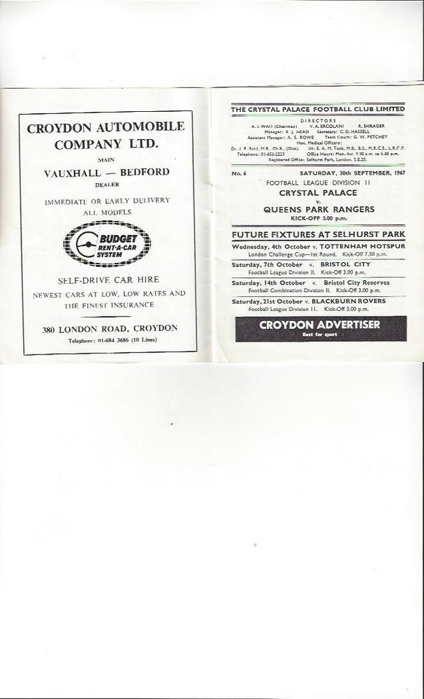1967/68 Crystal Palace v Queens Park Rangers Football Programme
