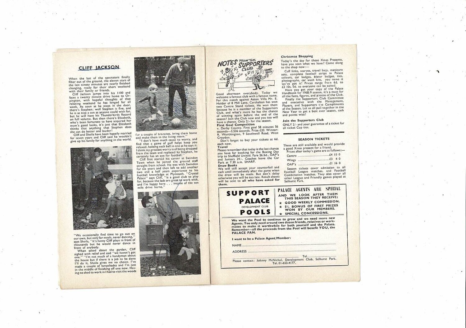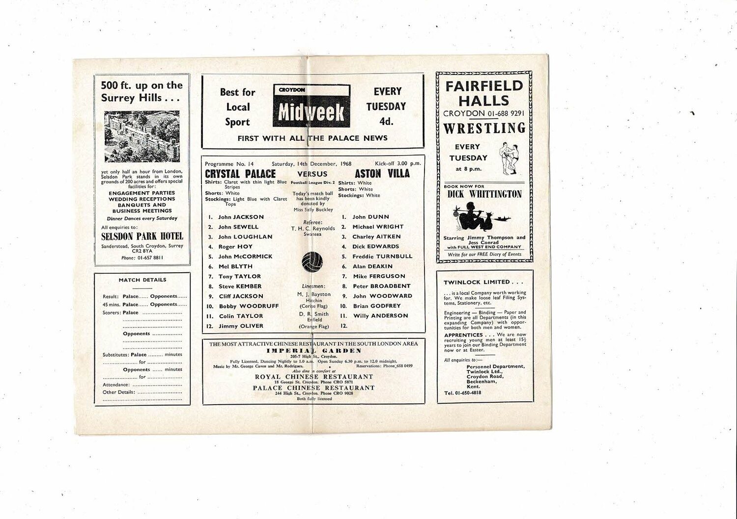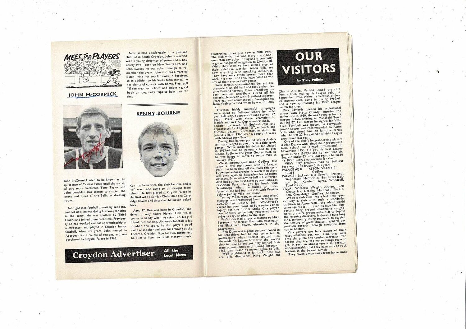 1968/69 Crystal Palace v Aston Villa Football Programme. Many Autographs