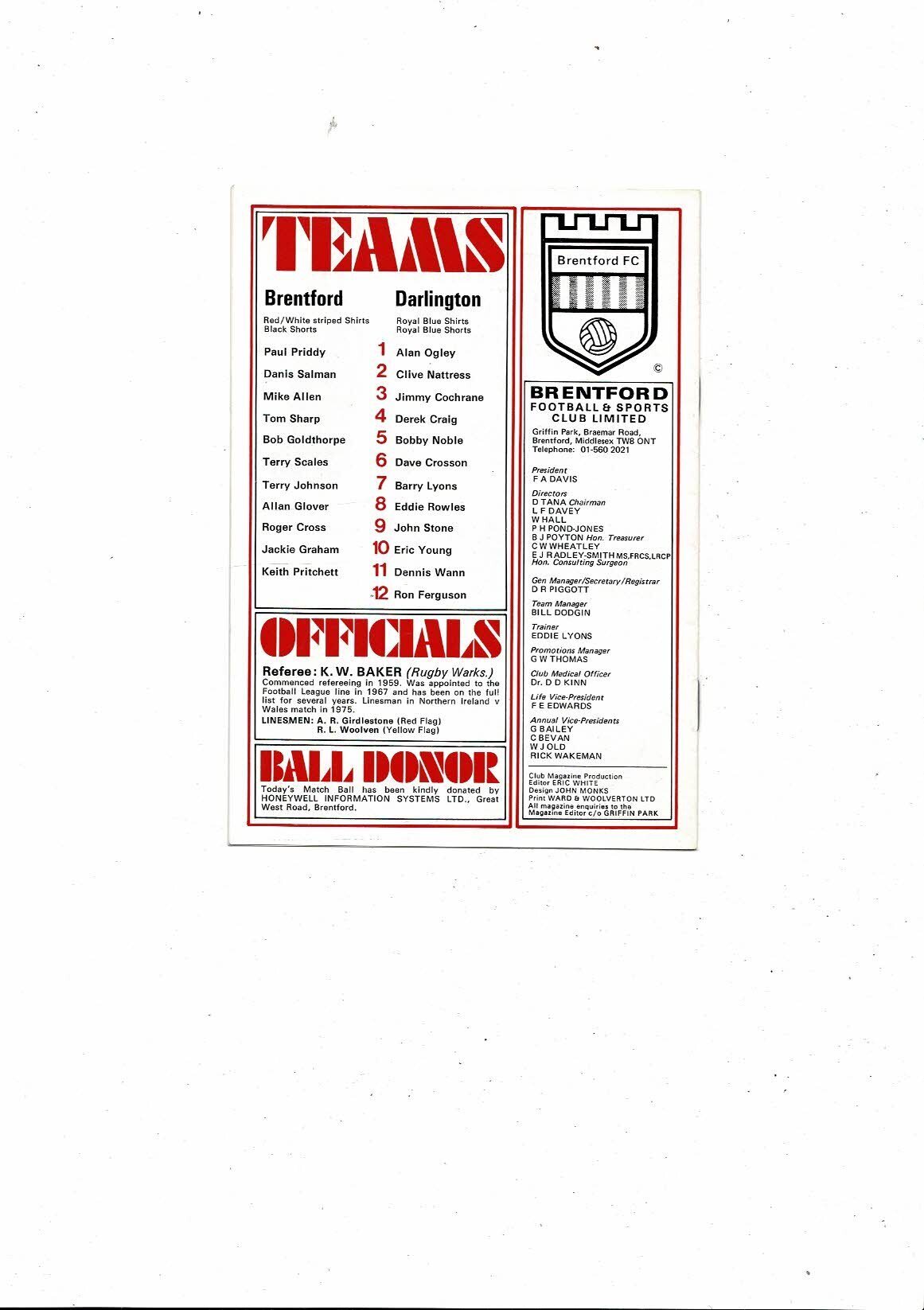 1976/77 Brentford v Darlington Football Programme