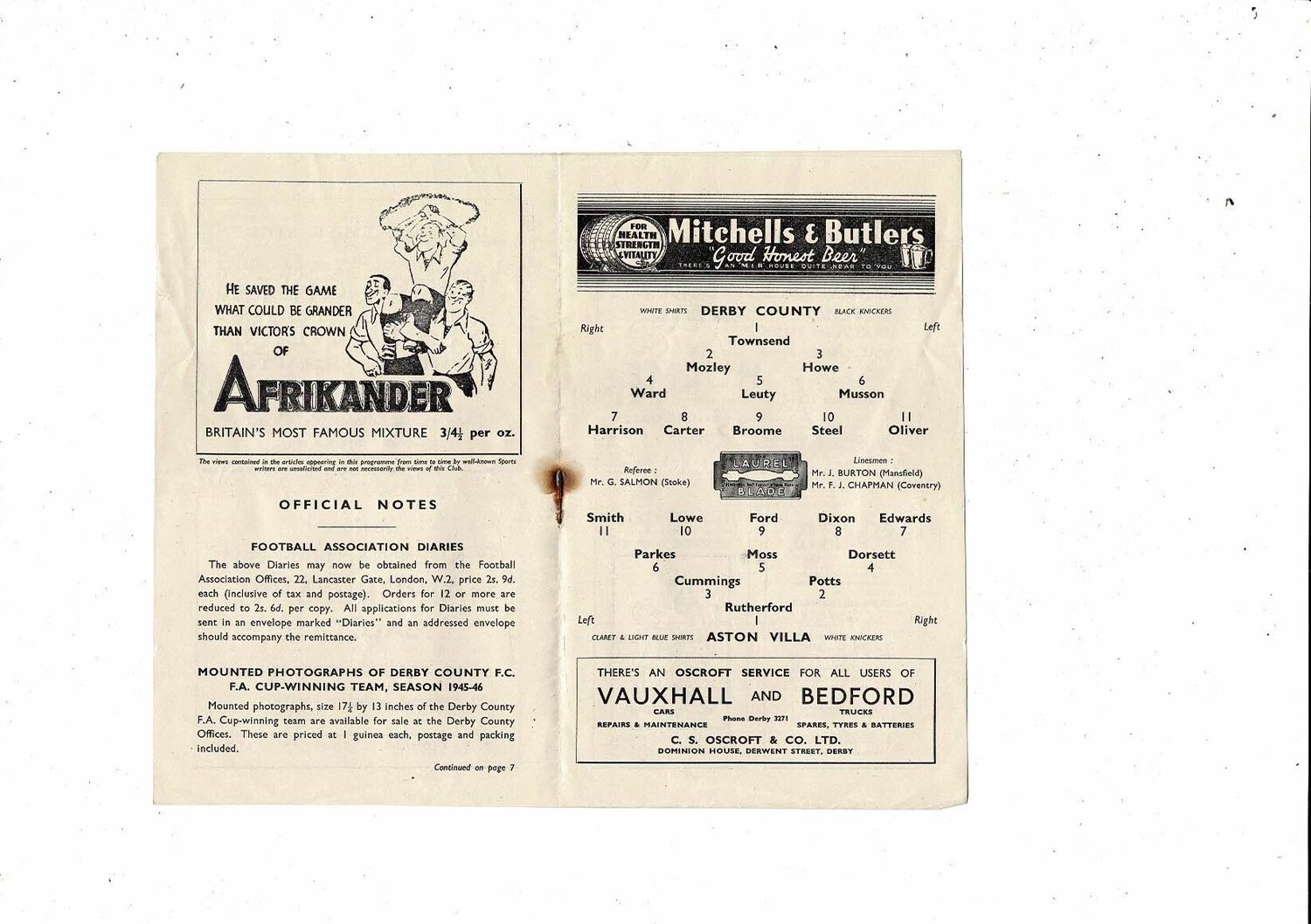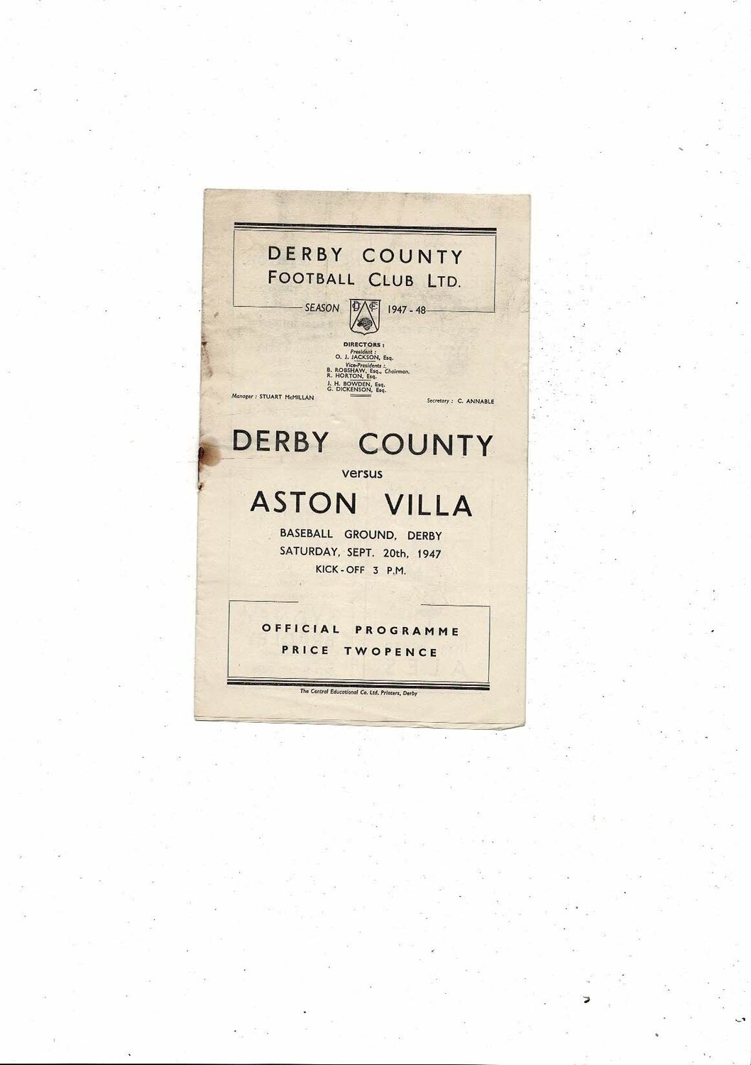 1947/48 Derby County v Aston Villa Football Programme