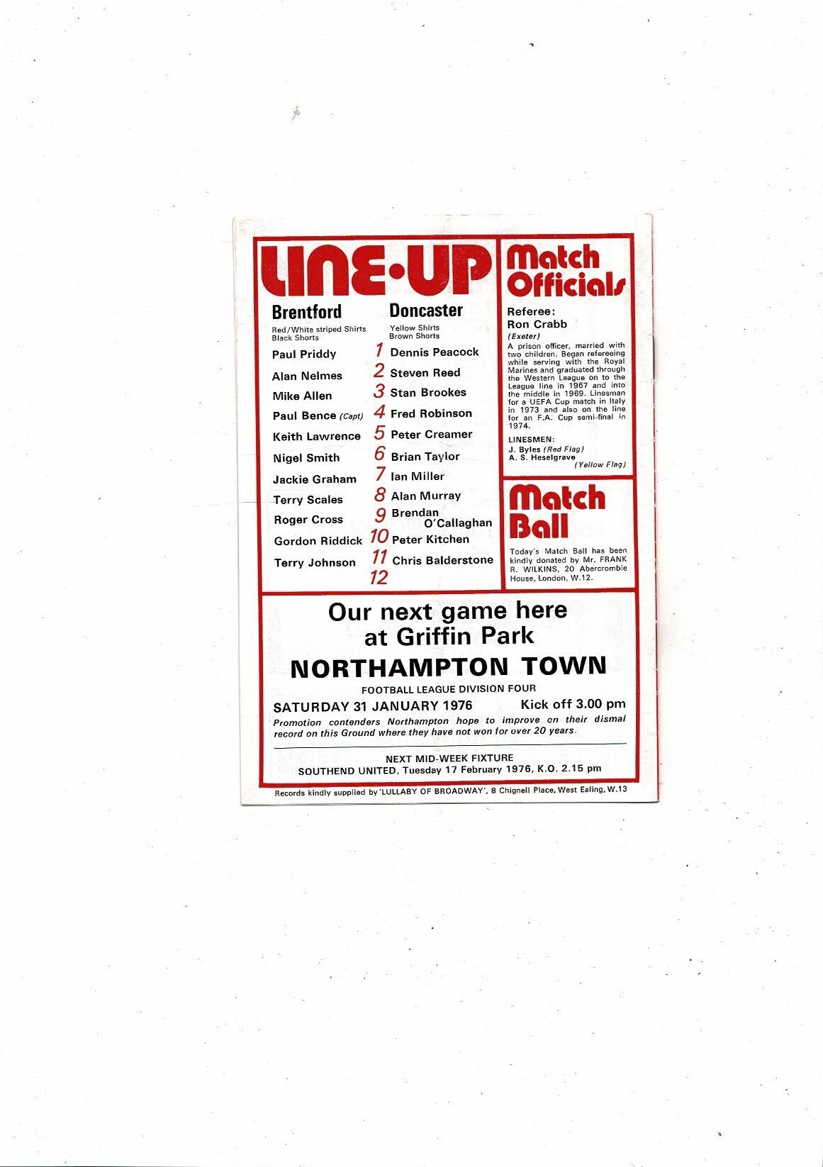 1975/76 Brentford v Doncaster Rovers Football Programme