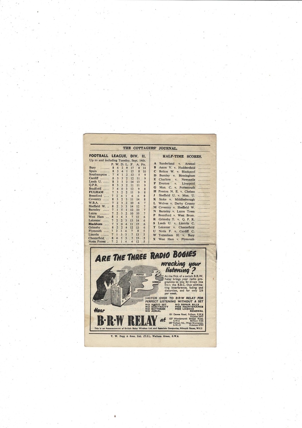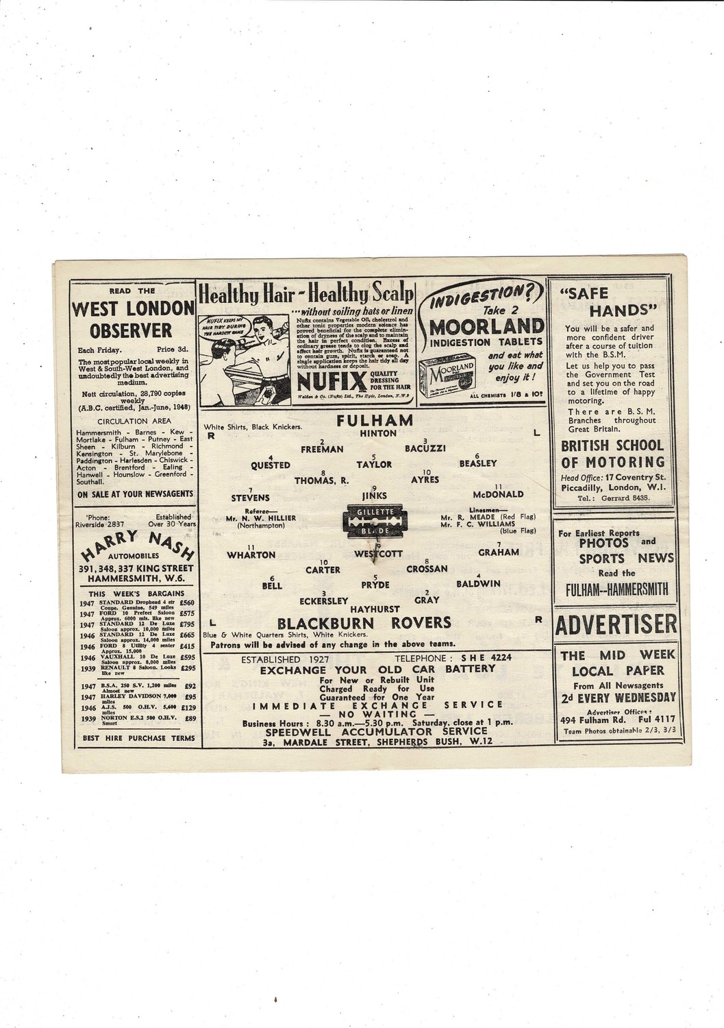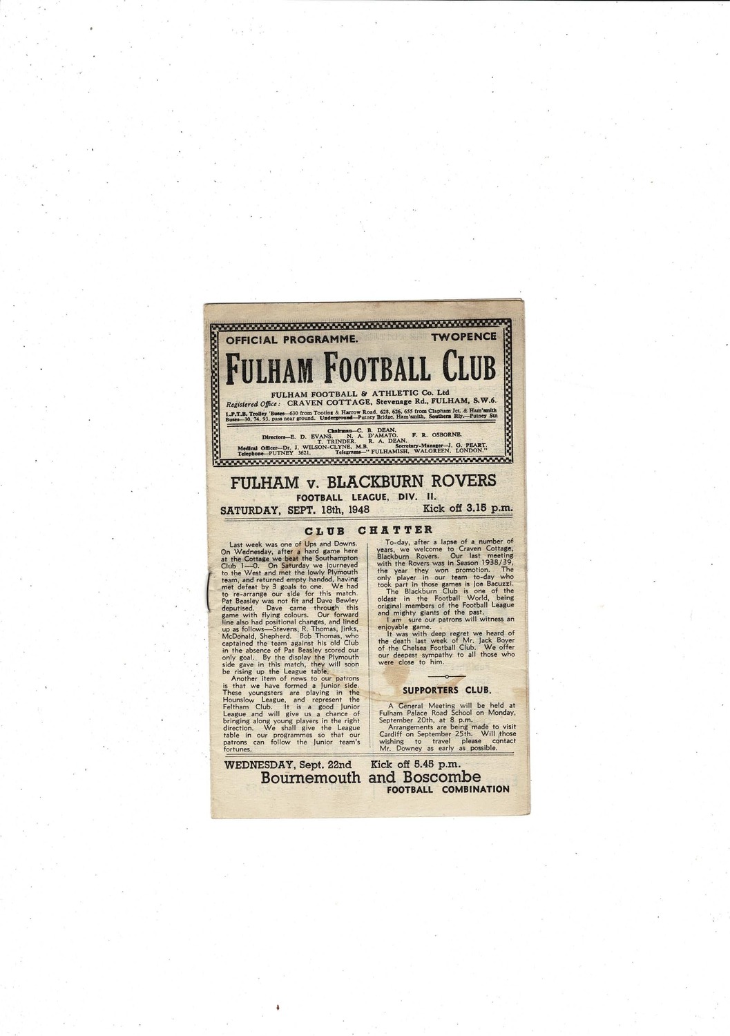 1948/49 Fulham v Blackburn Rovers Football Programme